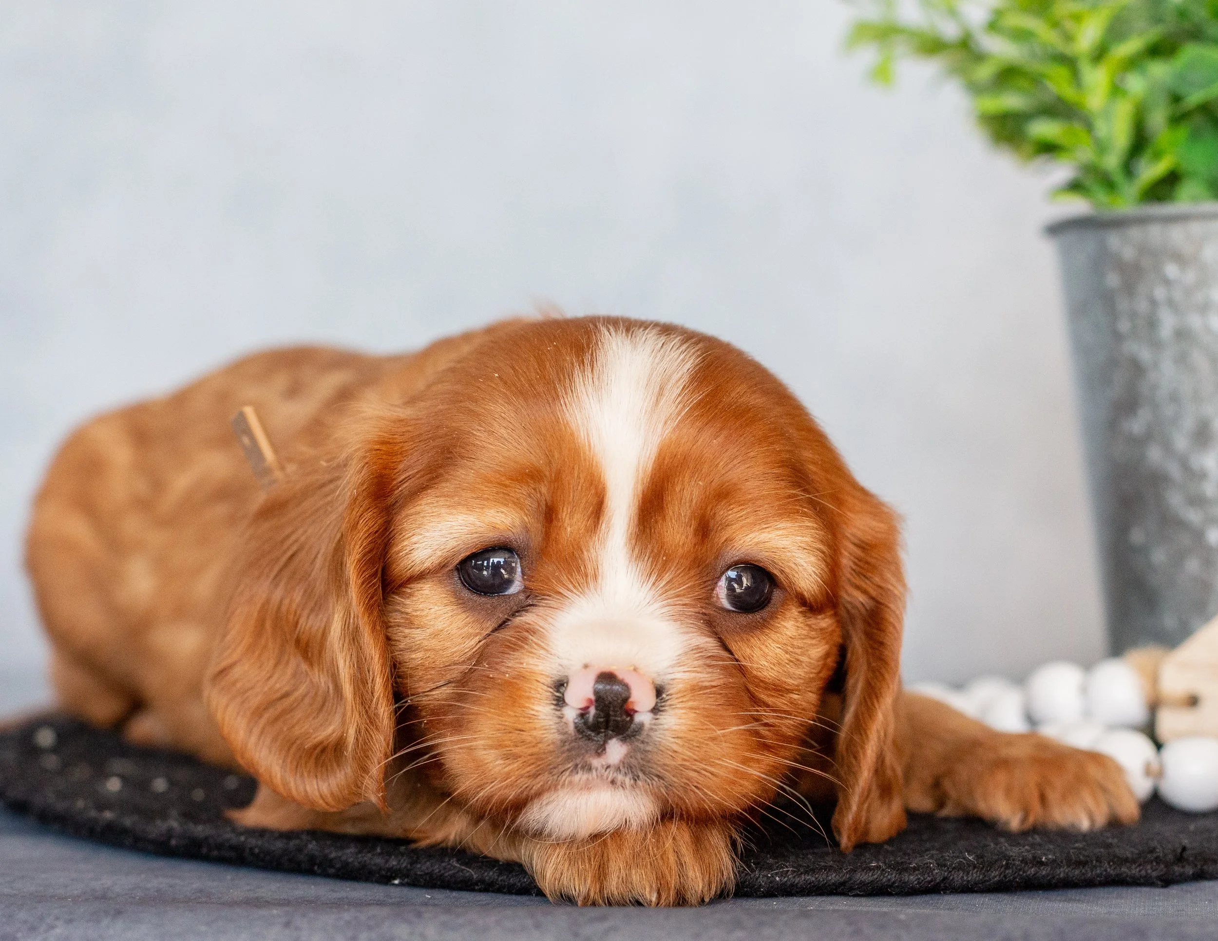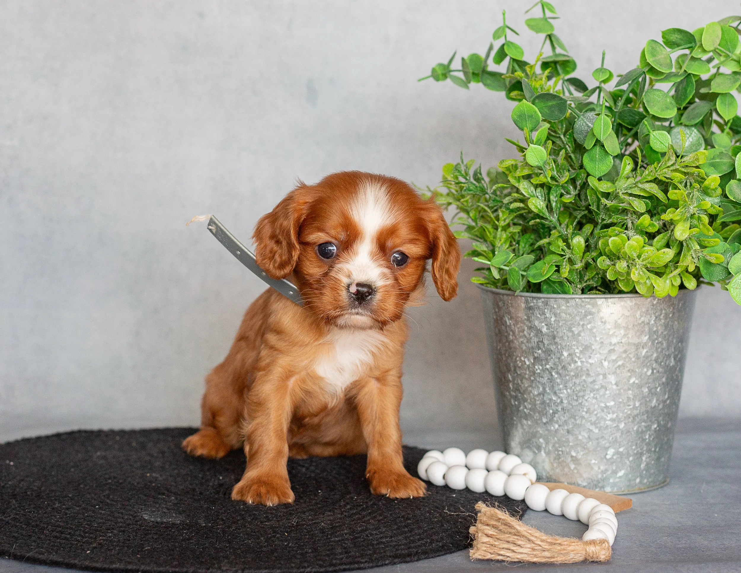 A brown and white puppy sitting on a black mat next to a silver pot with green plants and a string of white beads.