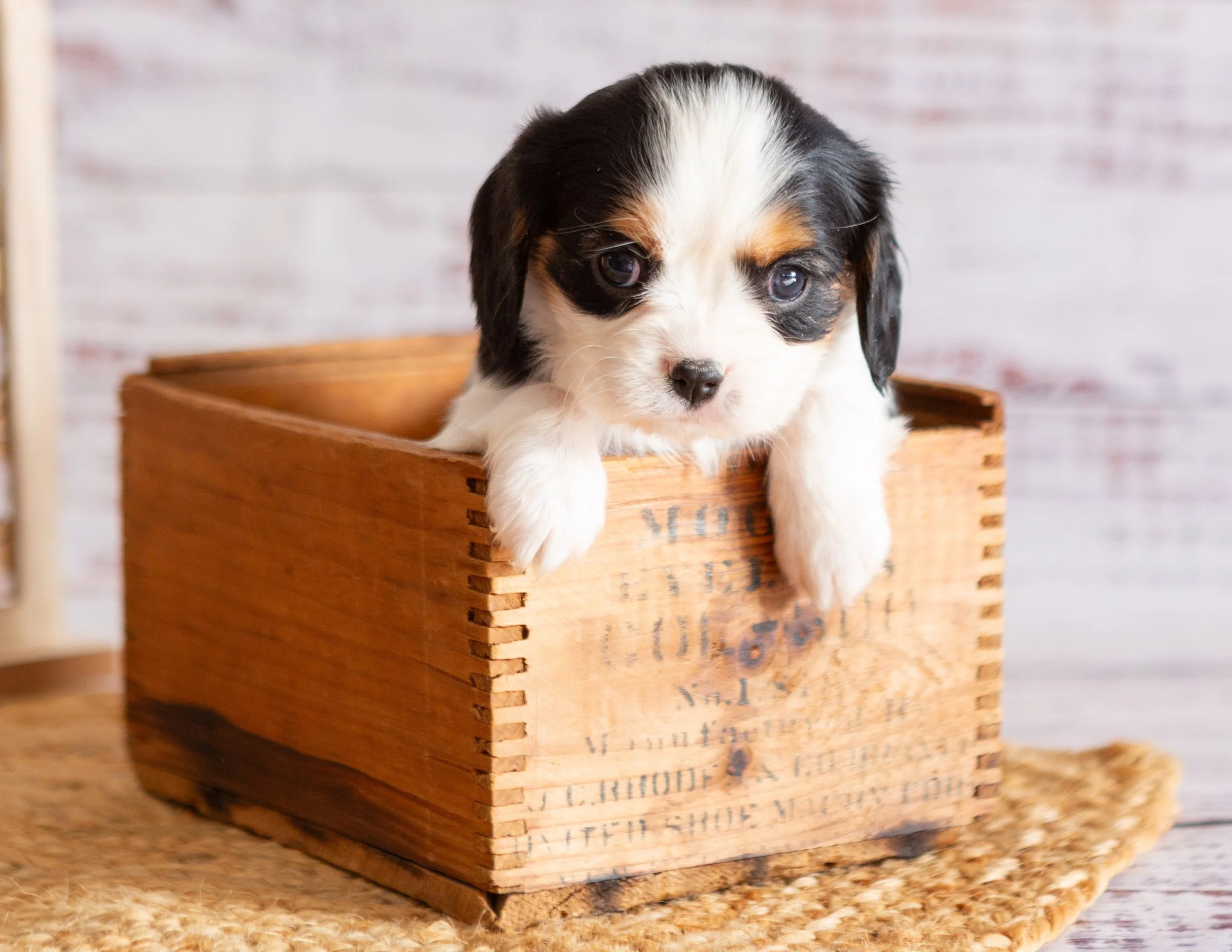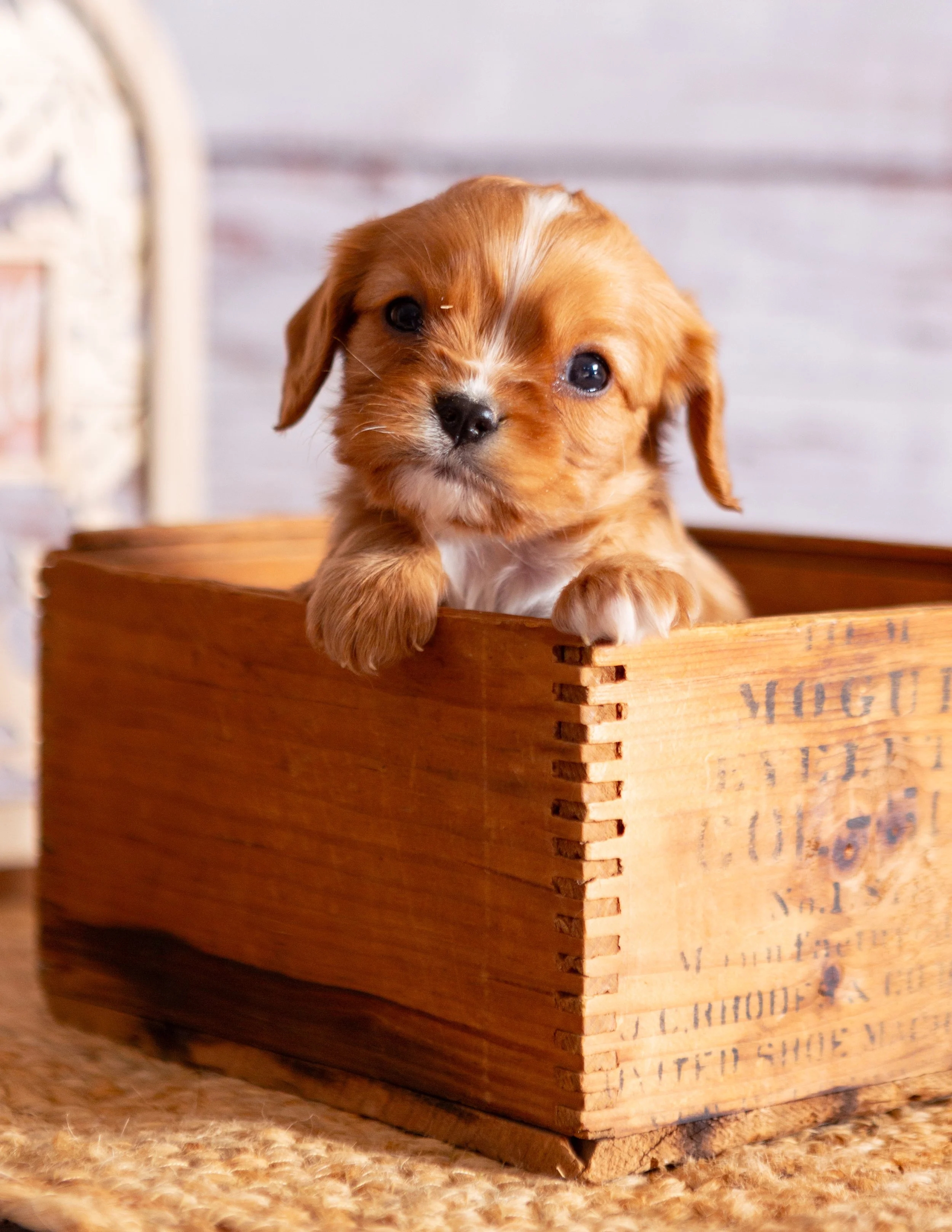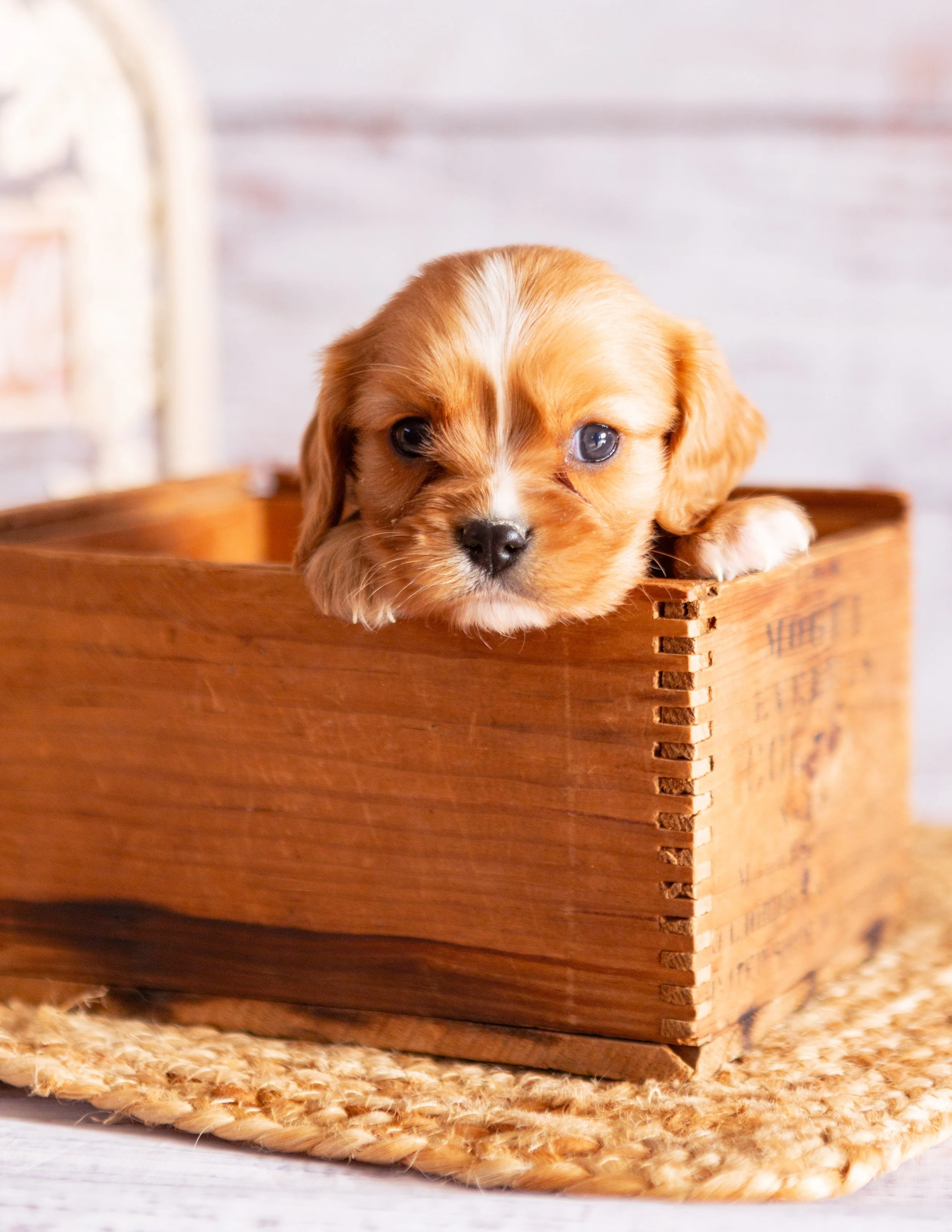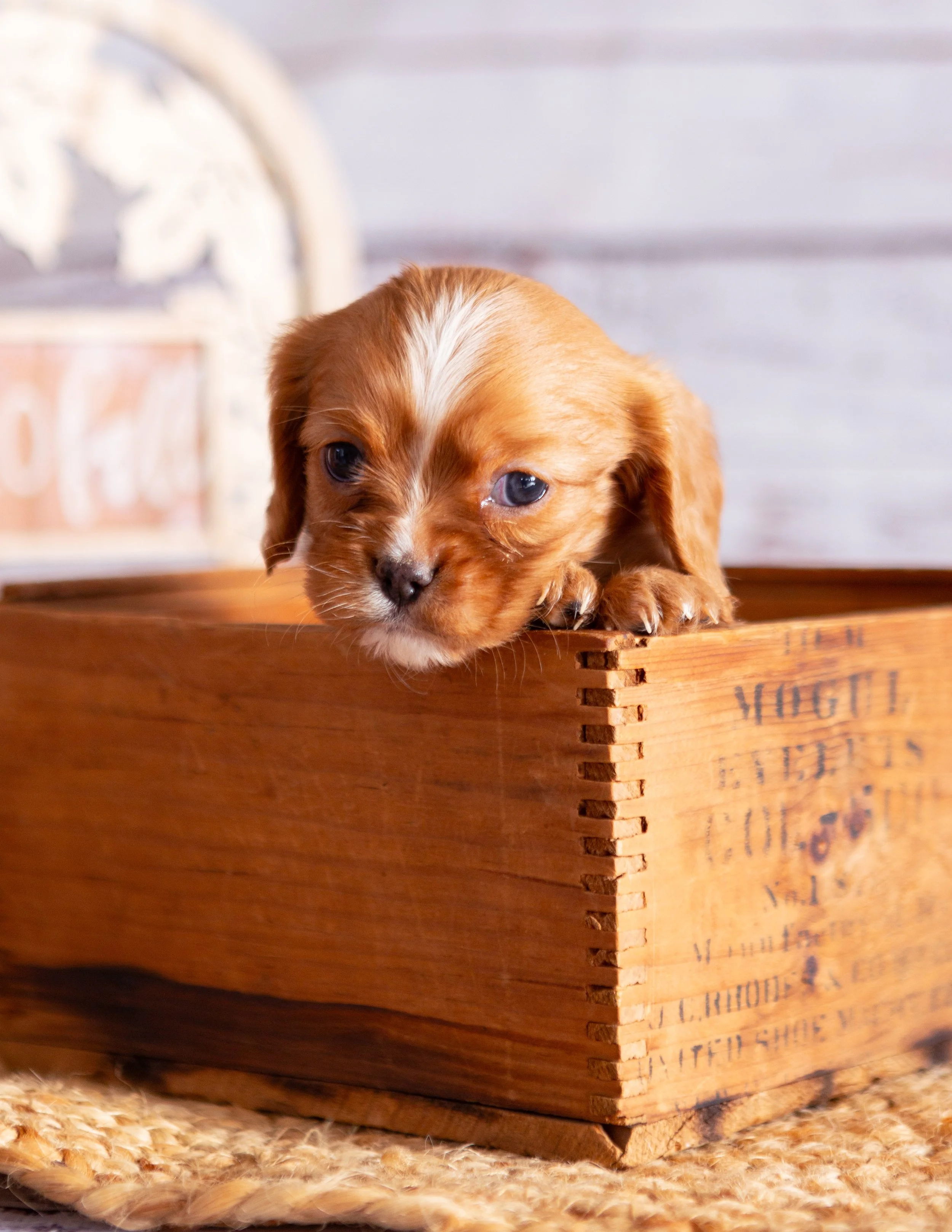 A cute puppy with brown and white fur resting its paws on the edge of a wooden box, looking at the camera. There is a woven mat underneath, with a plant and a decorative sign in the background.
