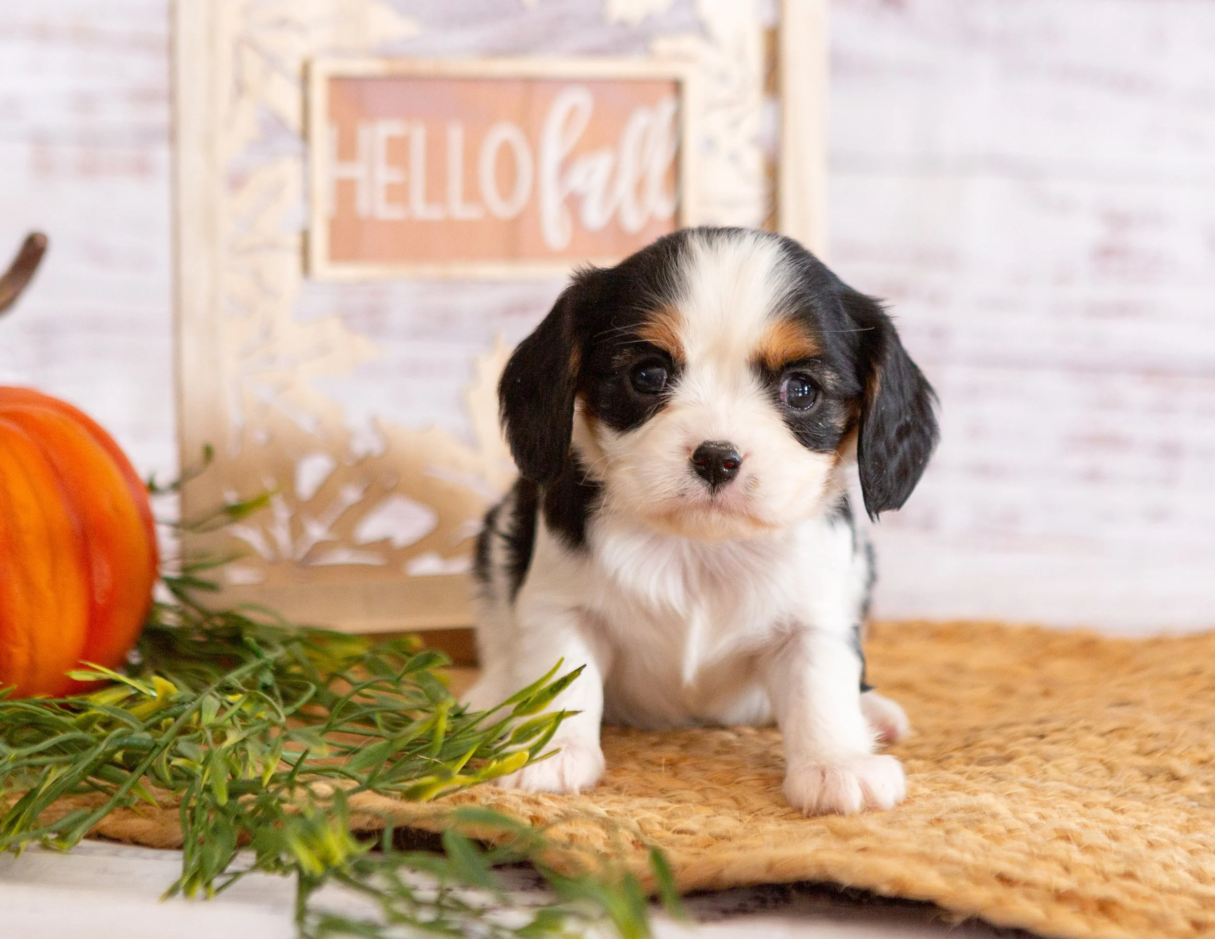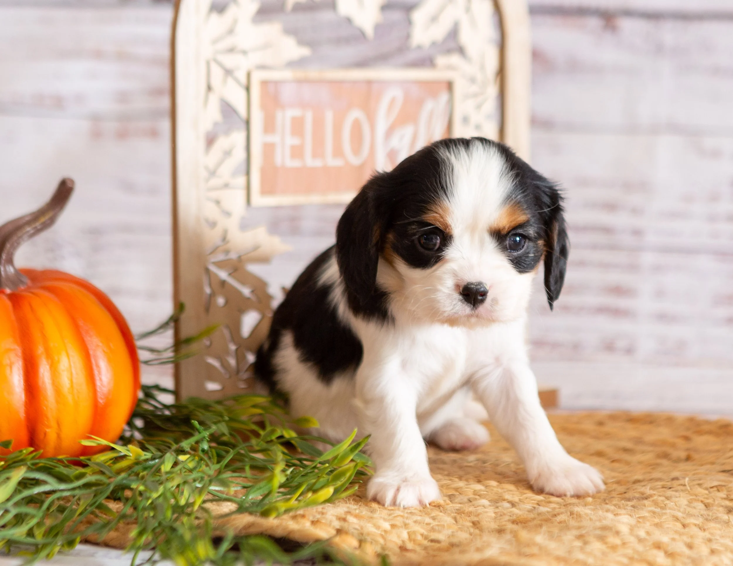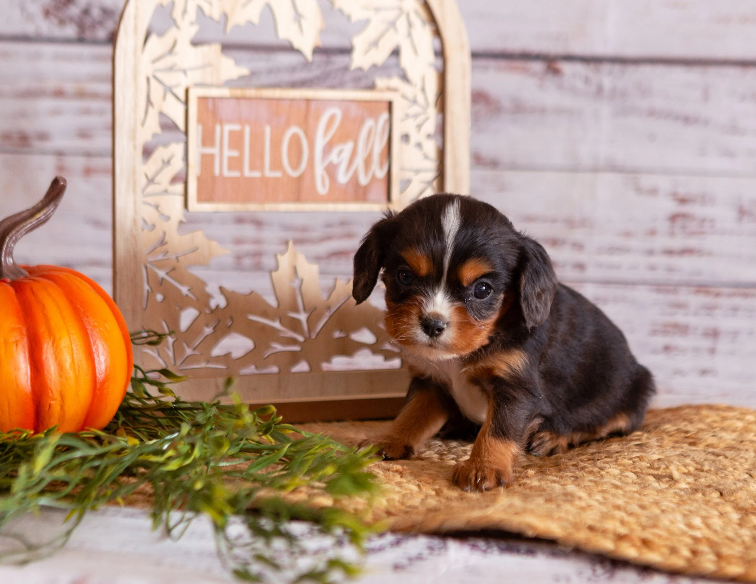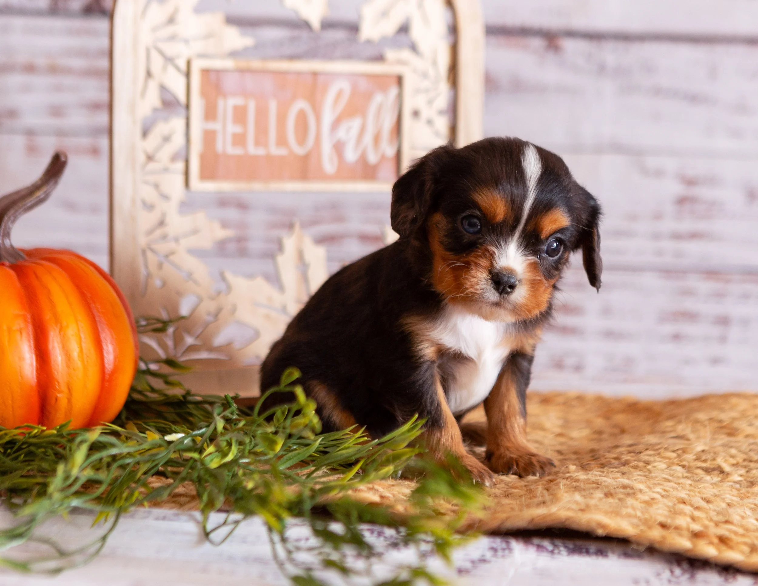 Adorable black, white, and brown puppy sitting on a woven mat next to a pumpkin and greenery, with a wooden sign in the background that says "Hello fall".