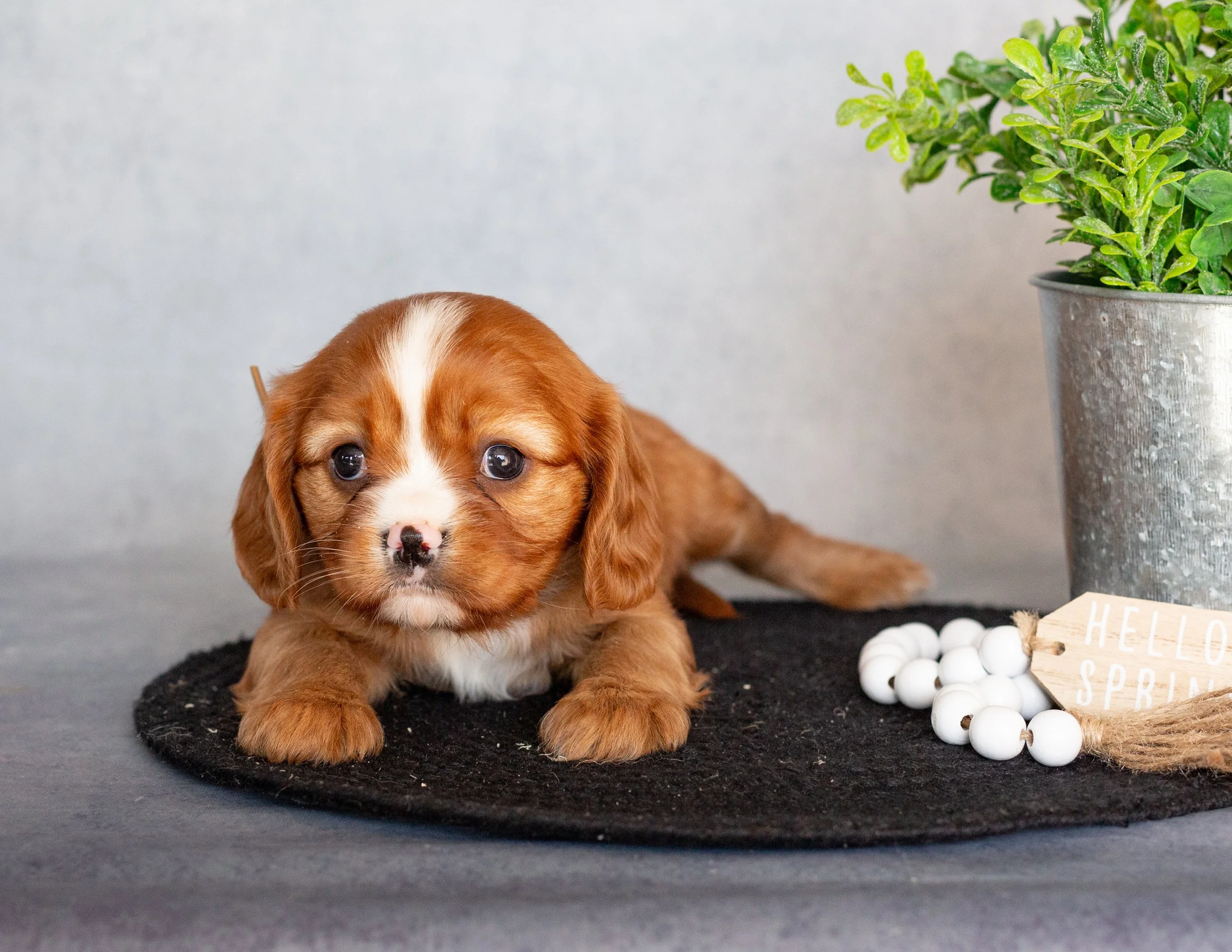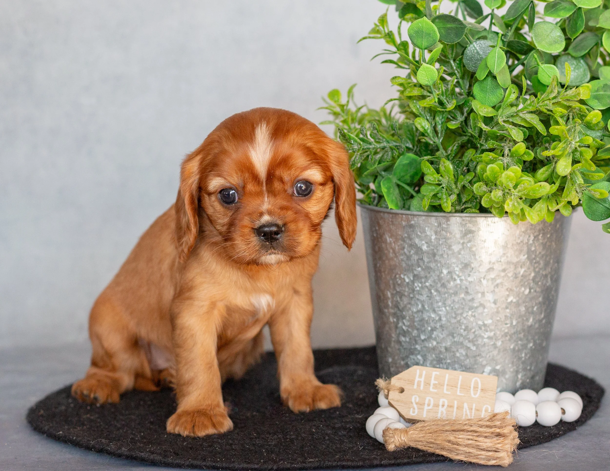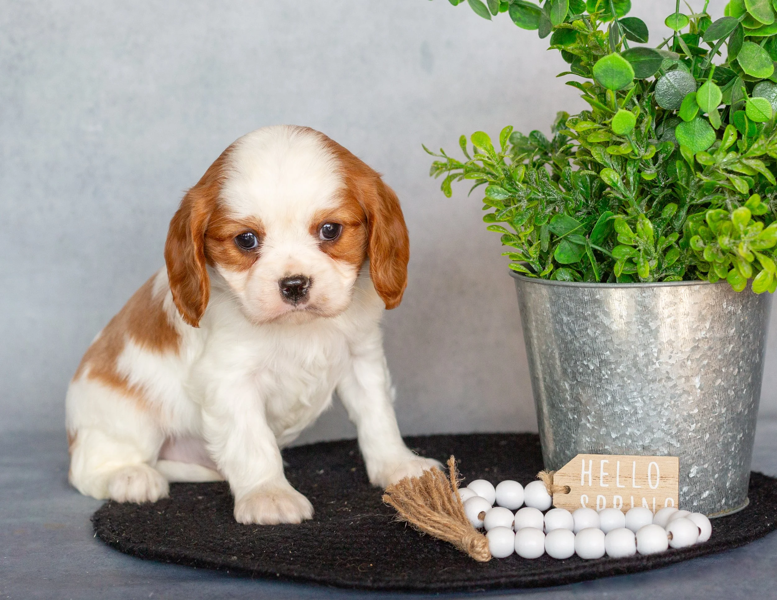 A cute brown and white puppy sitting on a black mat next to a silver potted plant. There is a small wooden sign that says 'Hello Spring' and a string of white beads in front of the plant.