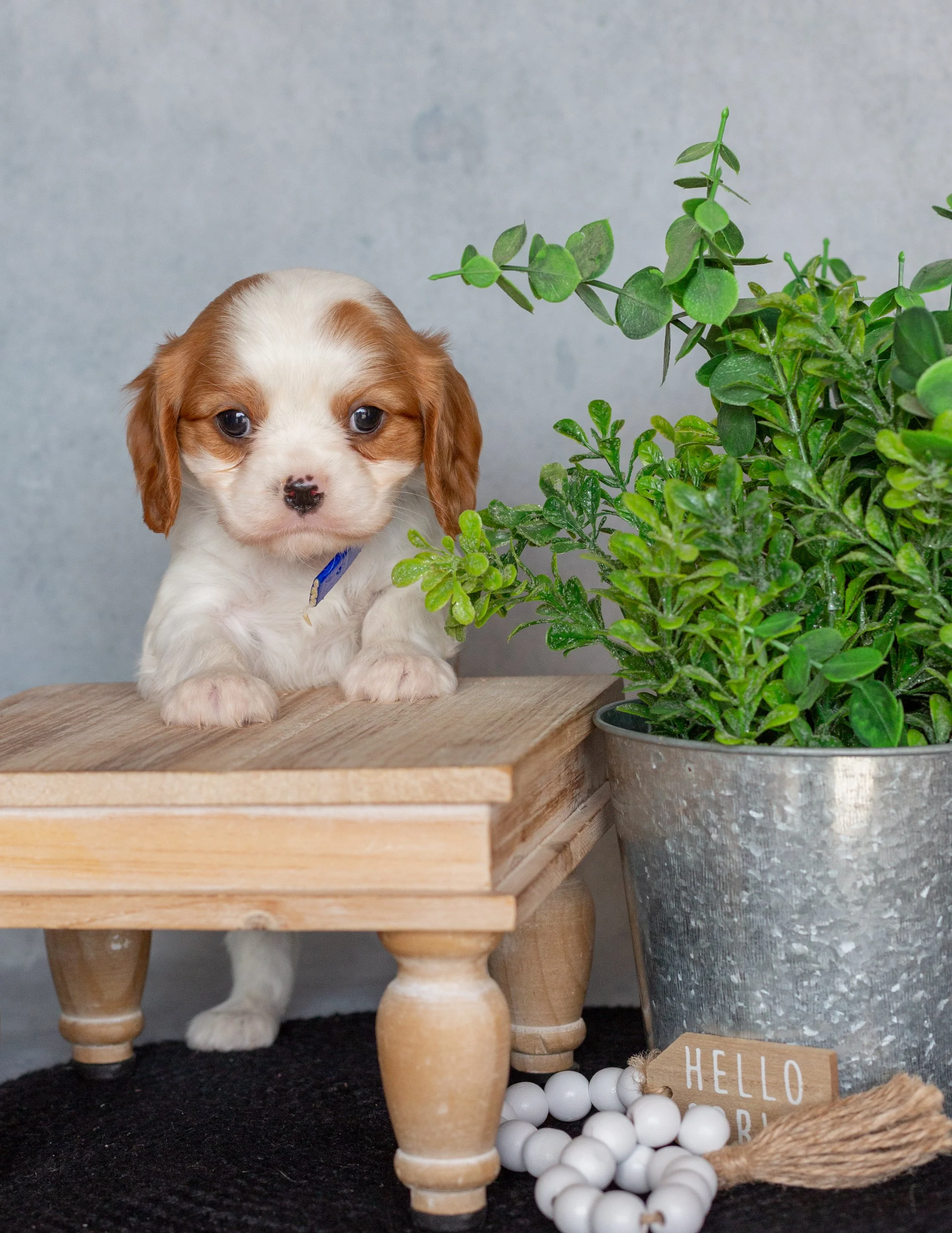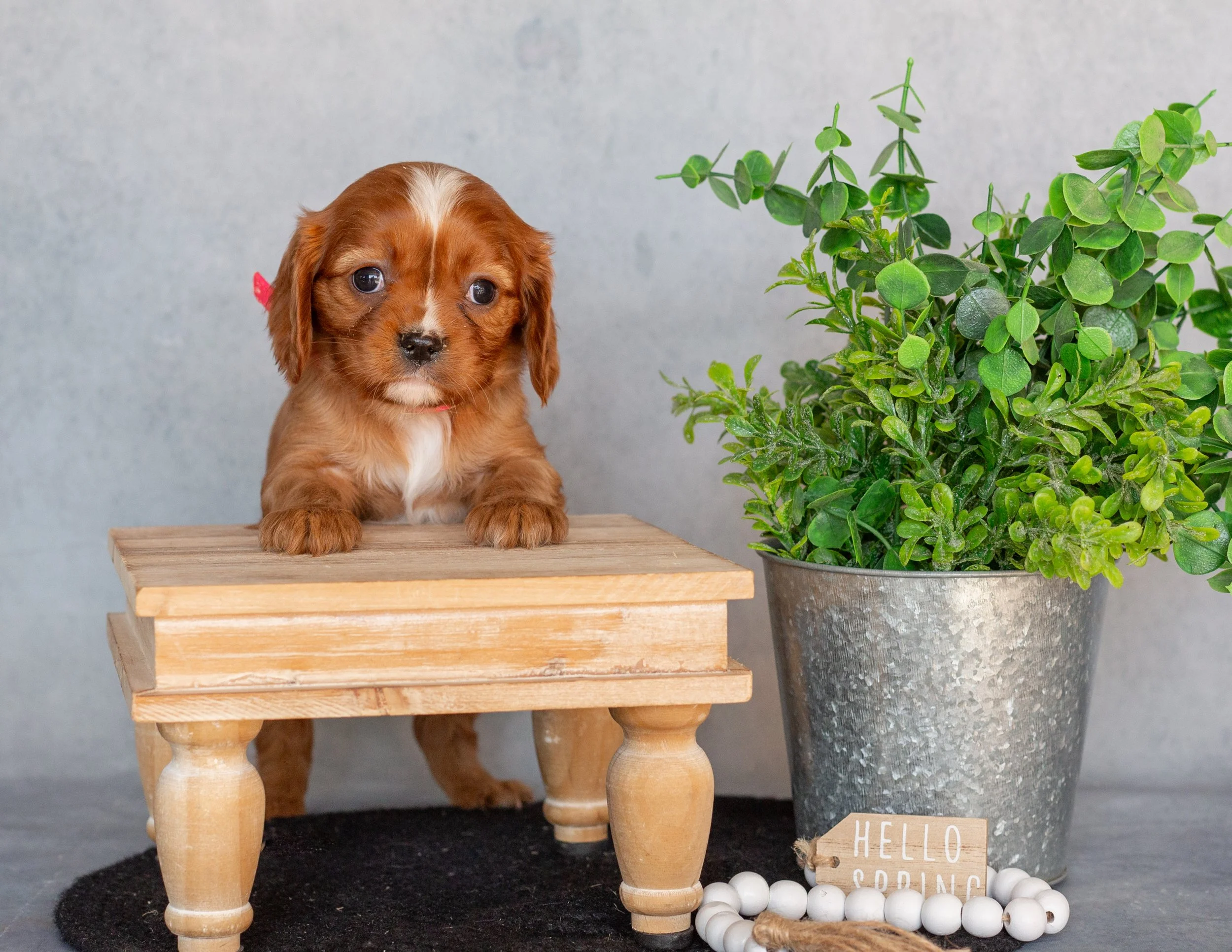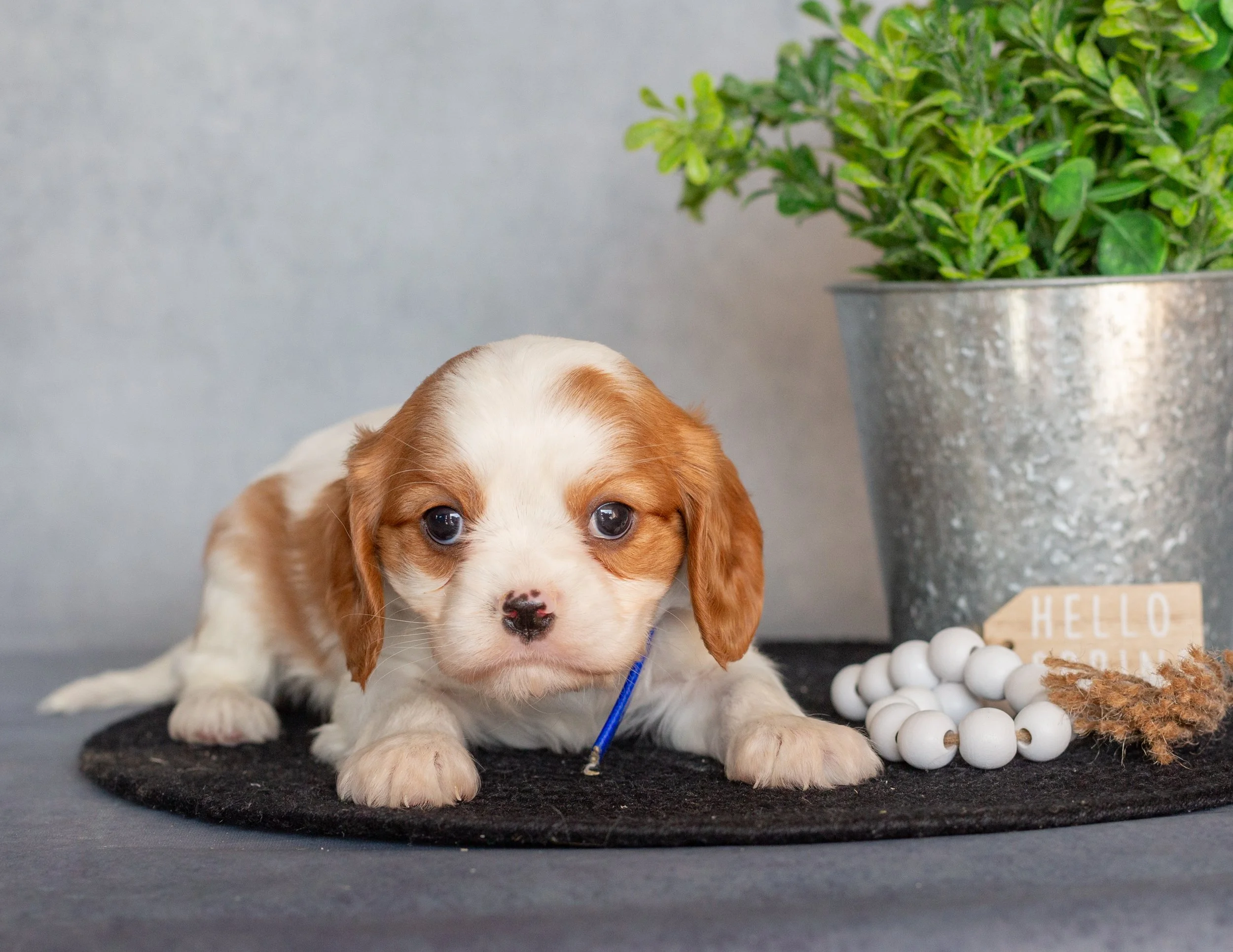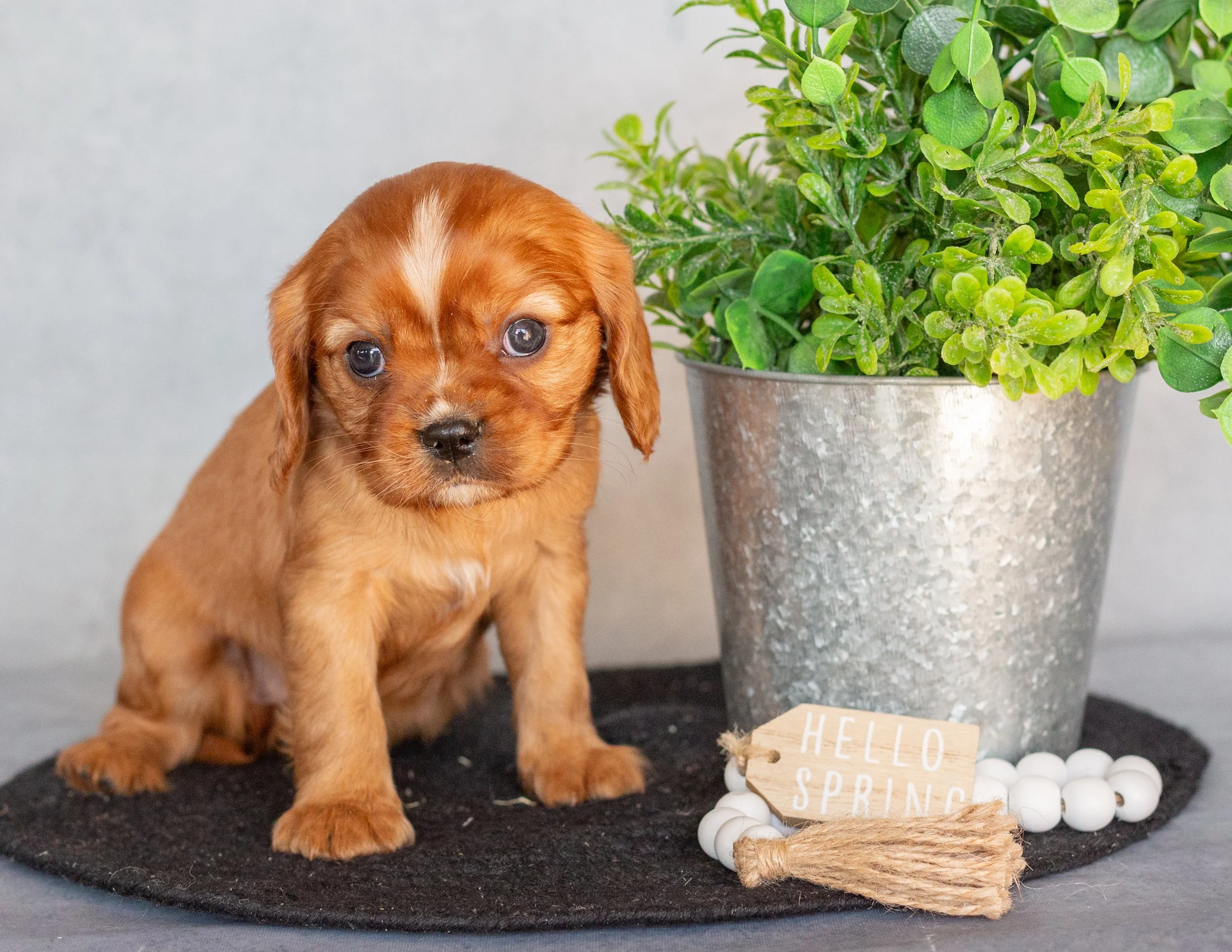 A cute brown and white puppy sitting on a black mat next to a silver potted plant. There is a small wooden sign that says 'Hello Spring' and a string of white beads in front of the plant.