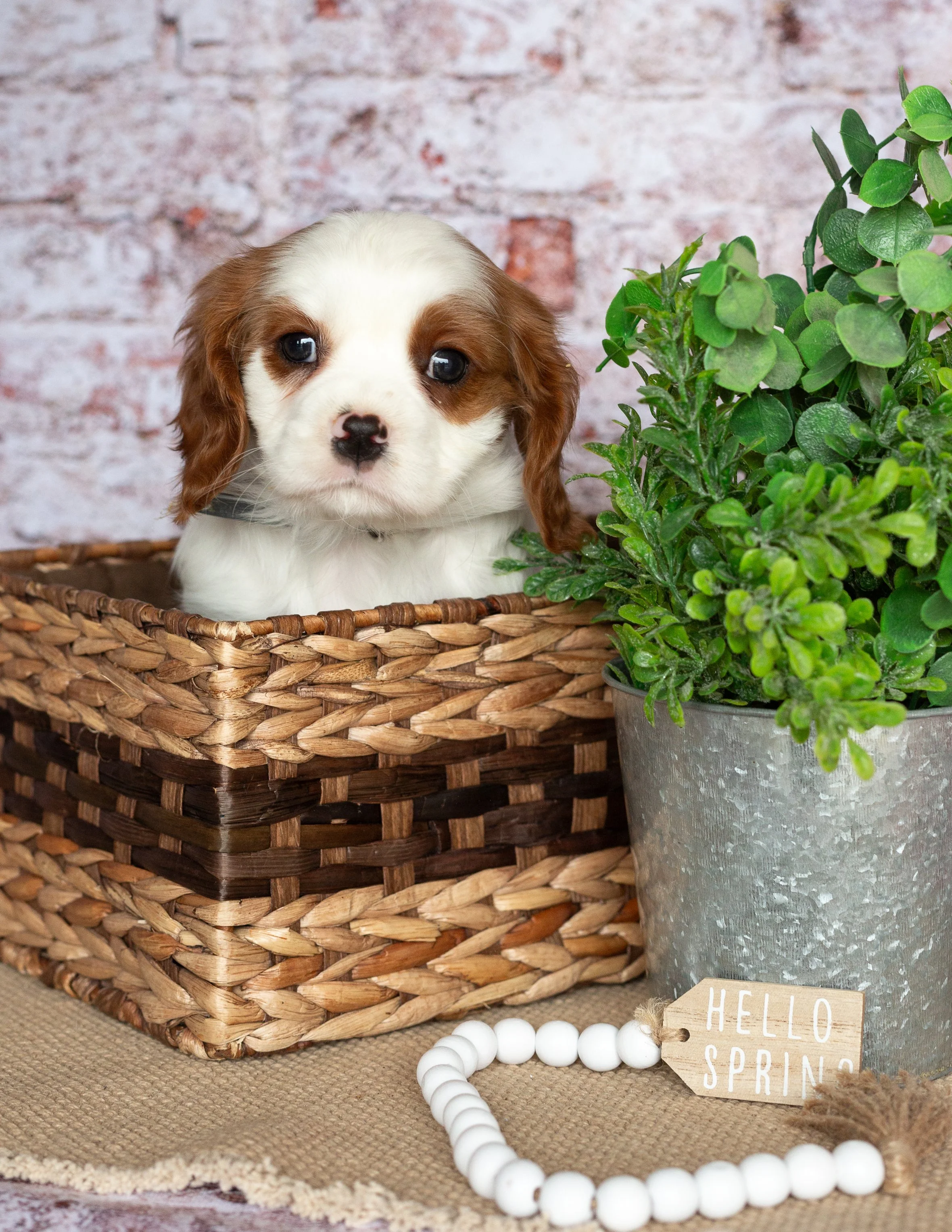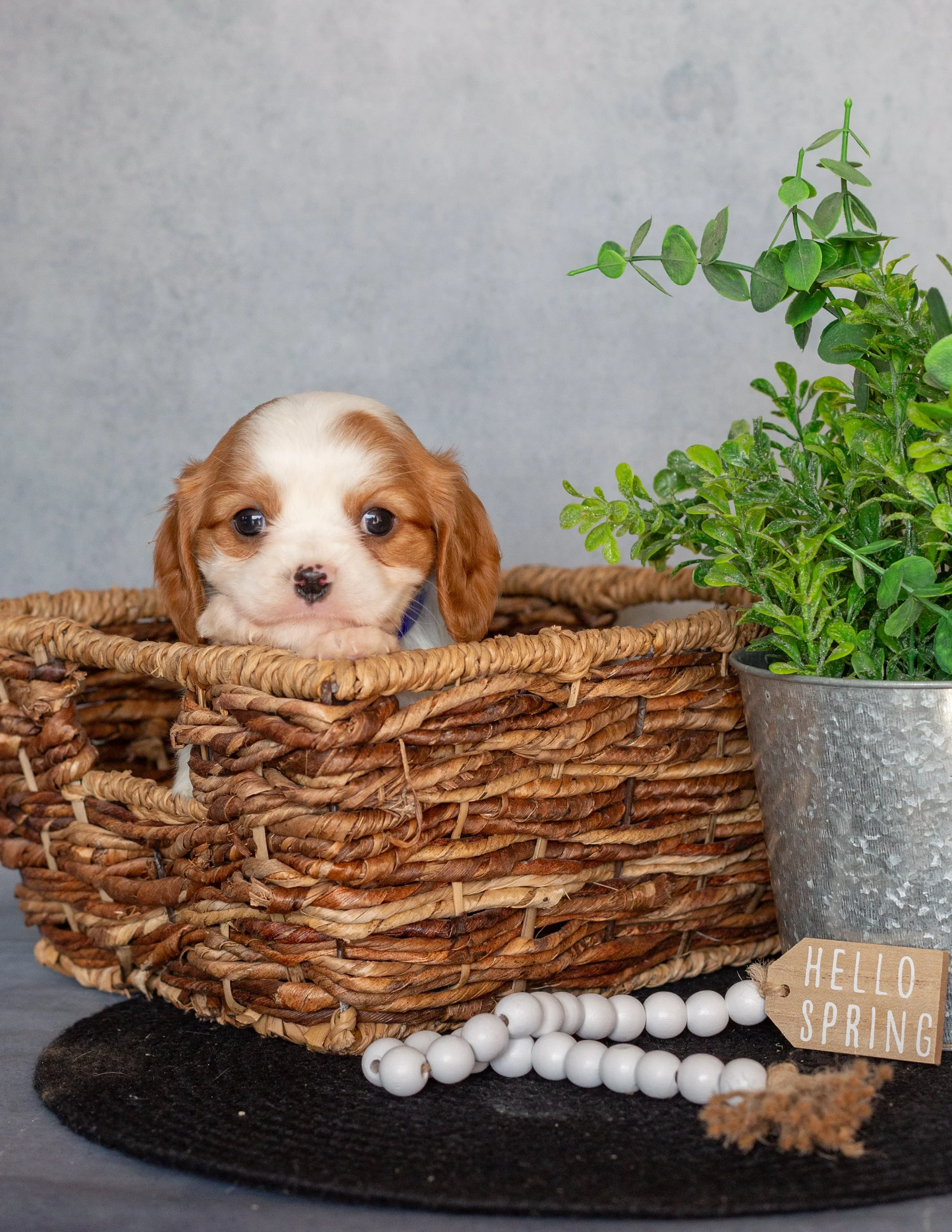 A cute brown and white puppy sitting in a woven basket next to a potted green plant on a black round mat with a small wooden sign reading 'HELLO SPRING' and white beads.