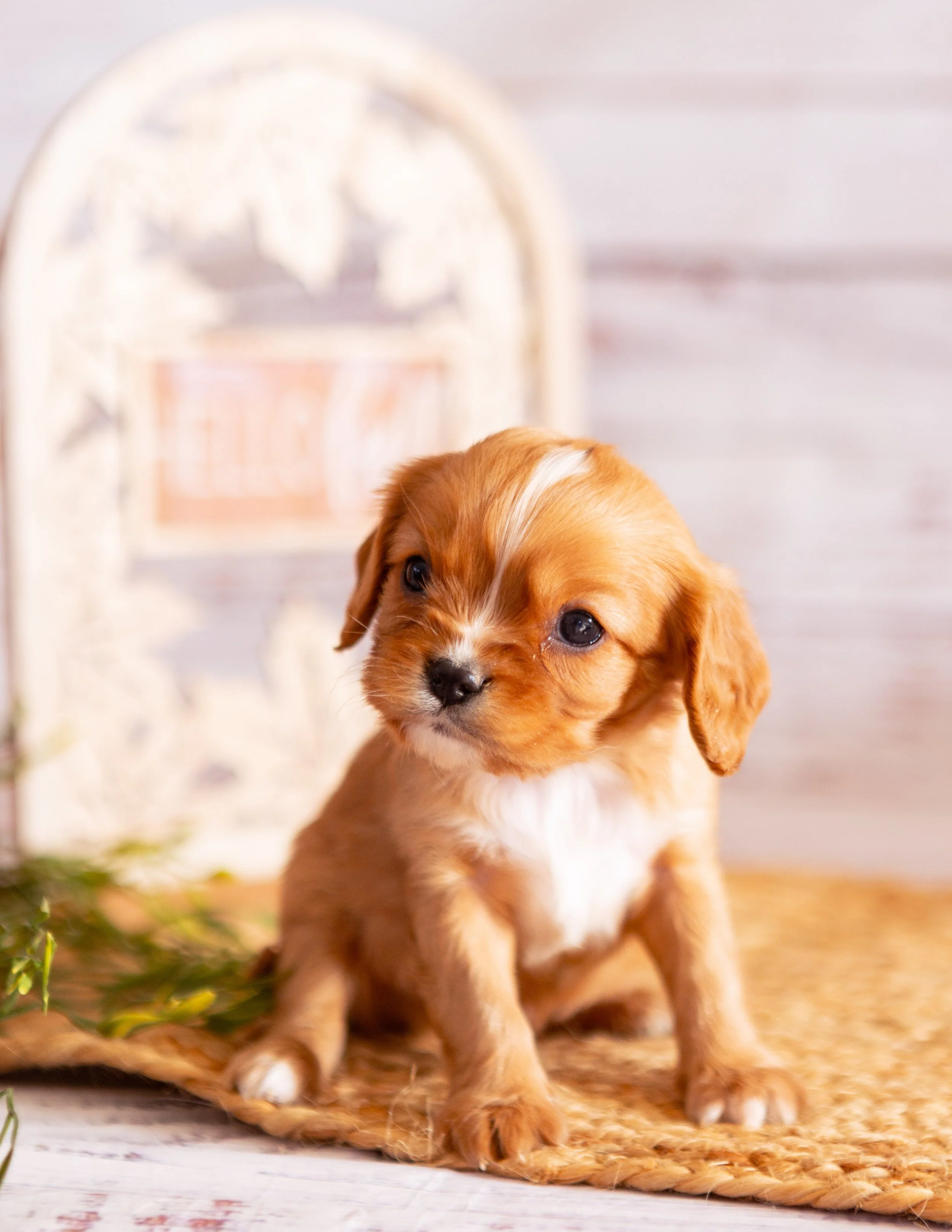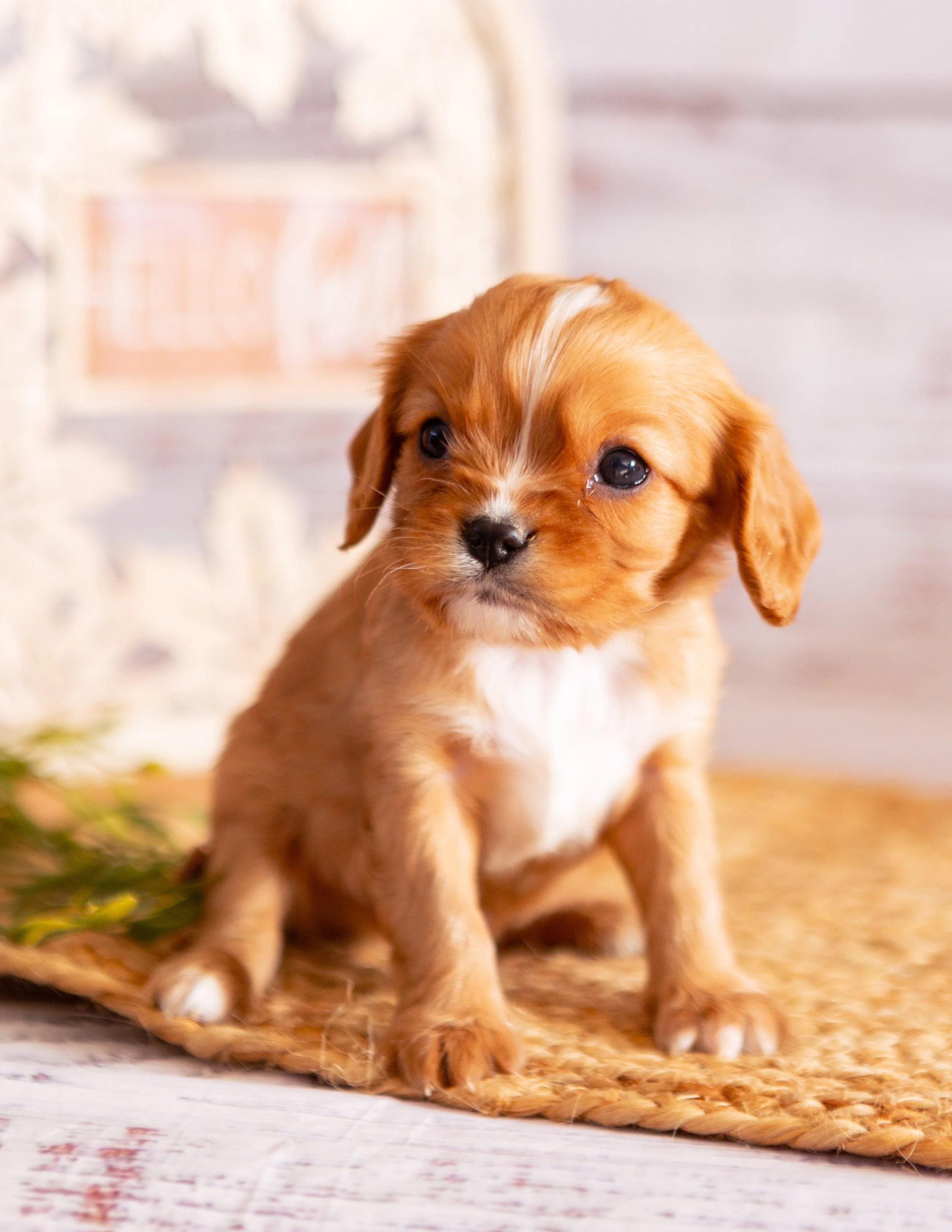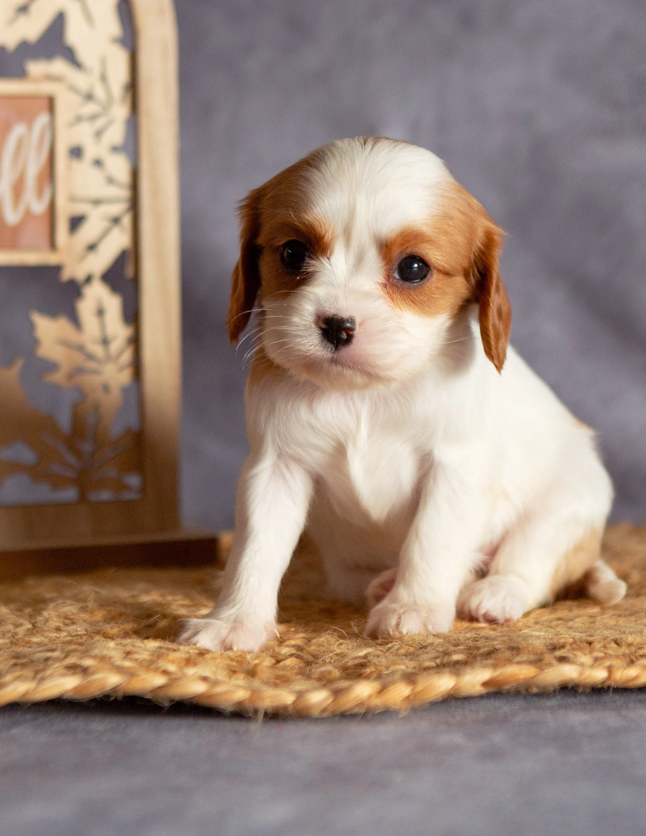 A small, brown and white puppy sitting on a woven mat with a blurred decorative sign in the background.