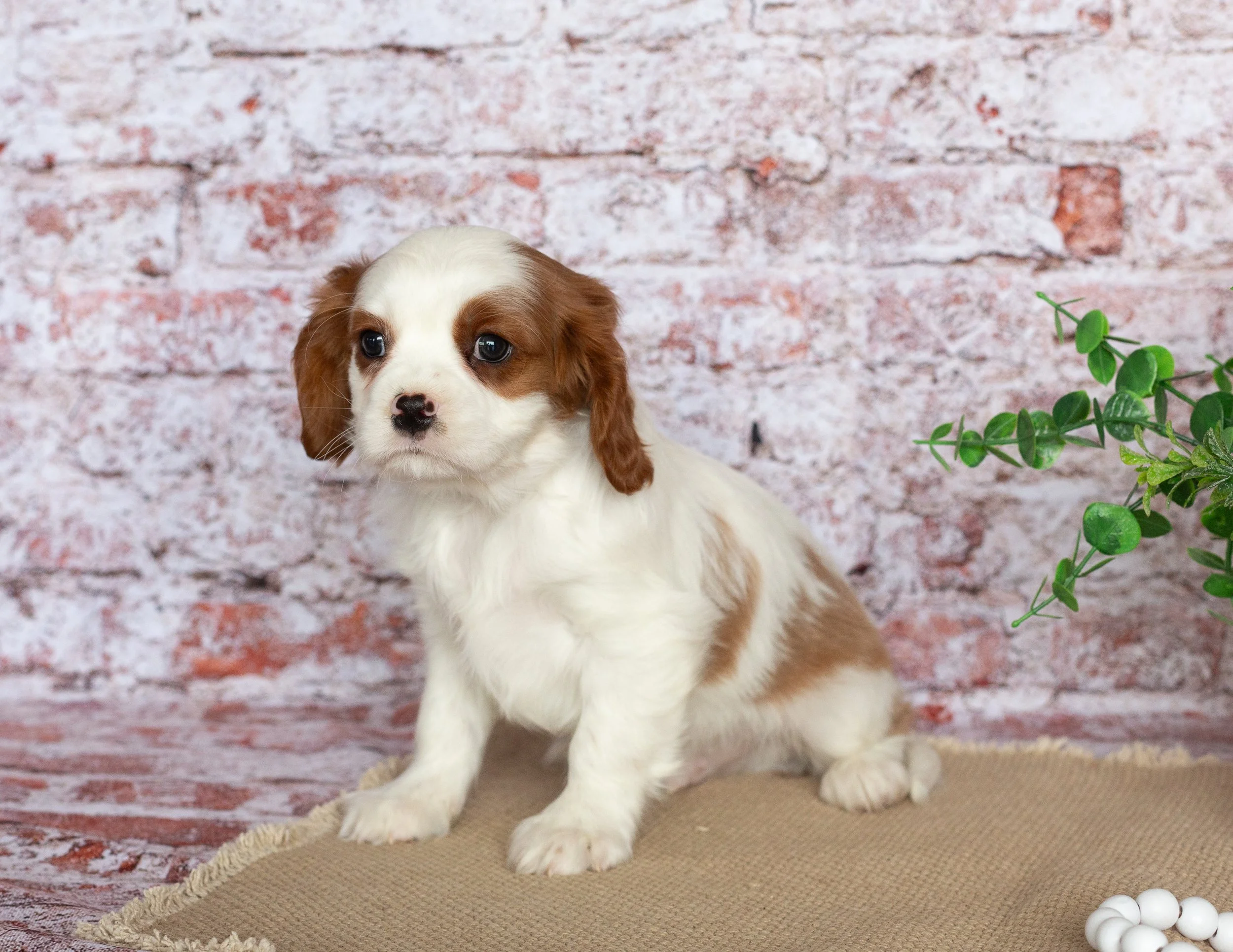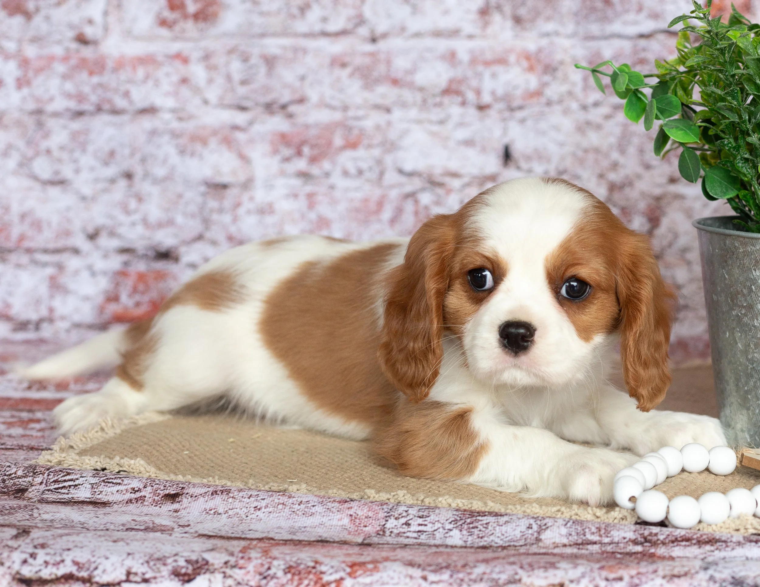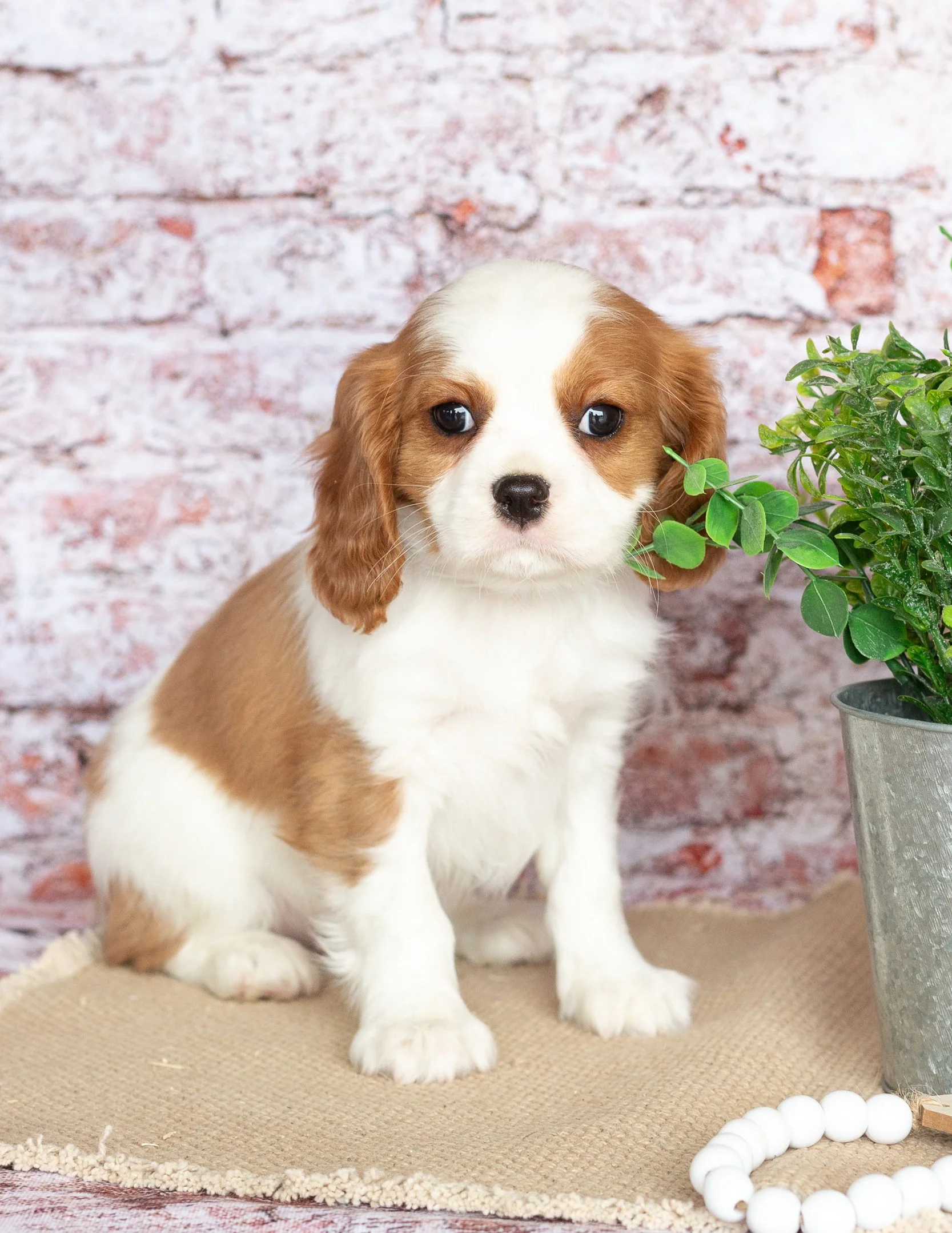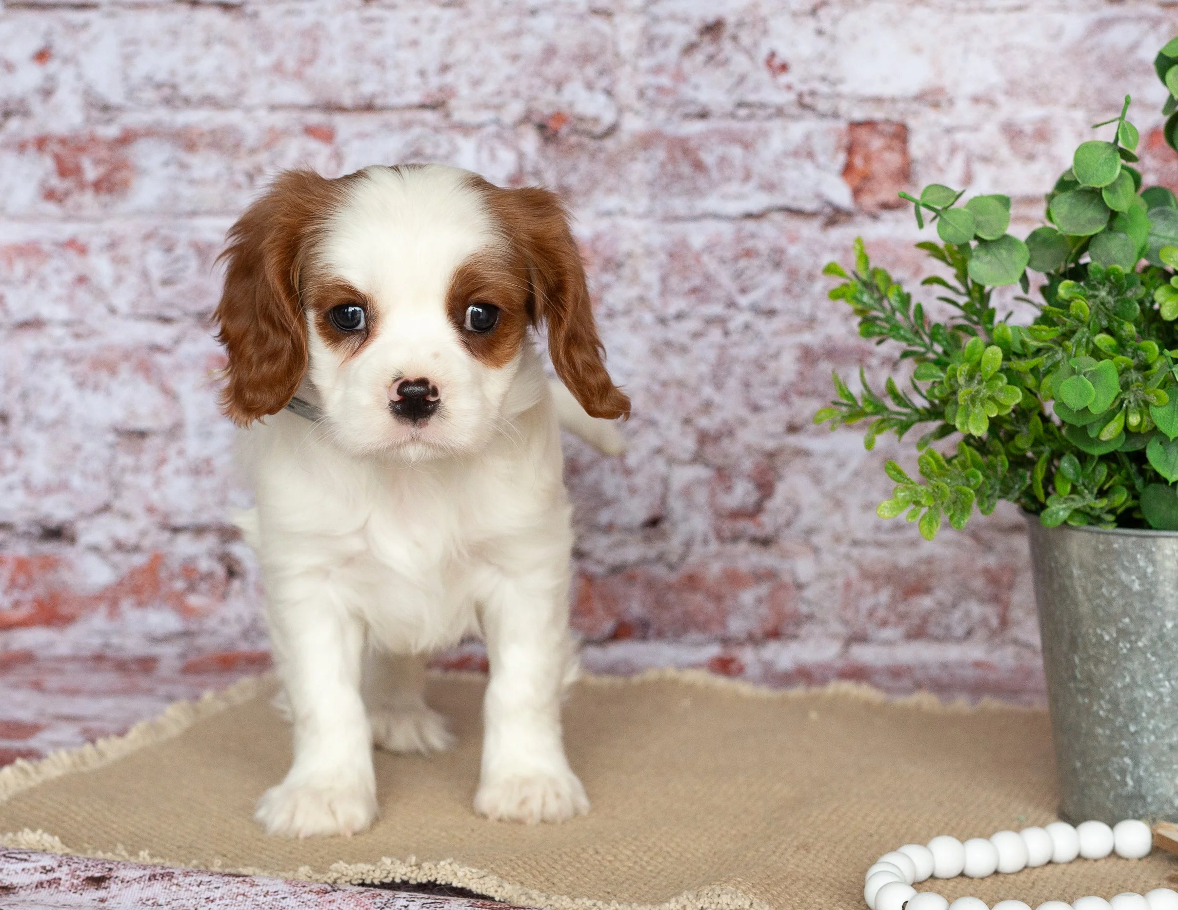 A cute Cavalier King Charles Spaniel puppy with brown and white fur sitting on a beige surface next to a potted green plant, with a string of white beads nearby, against a brick wall background.