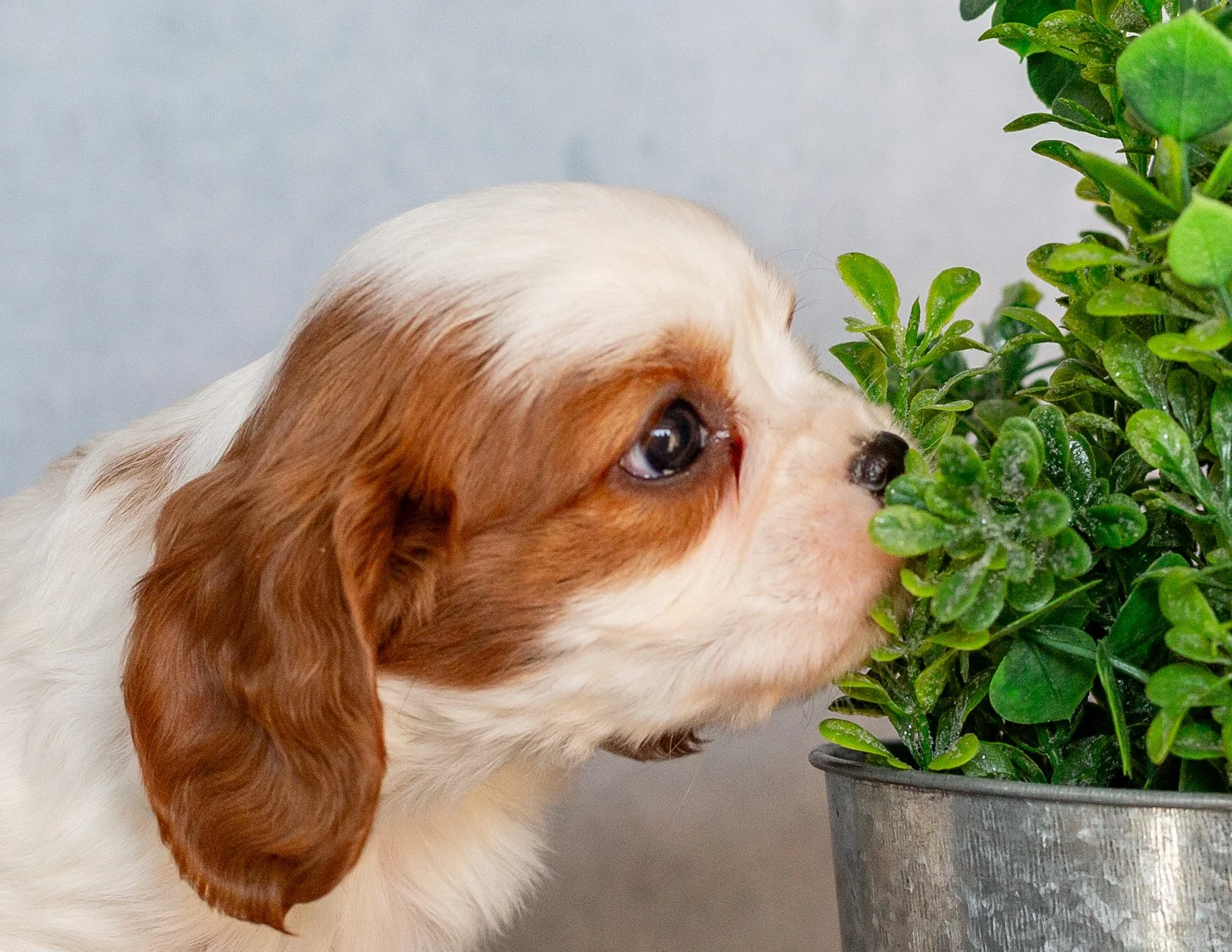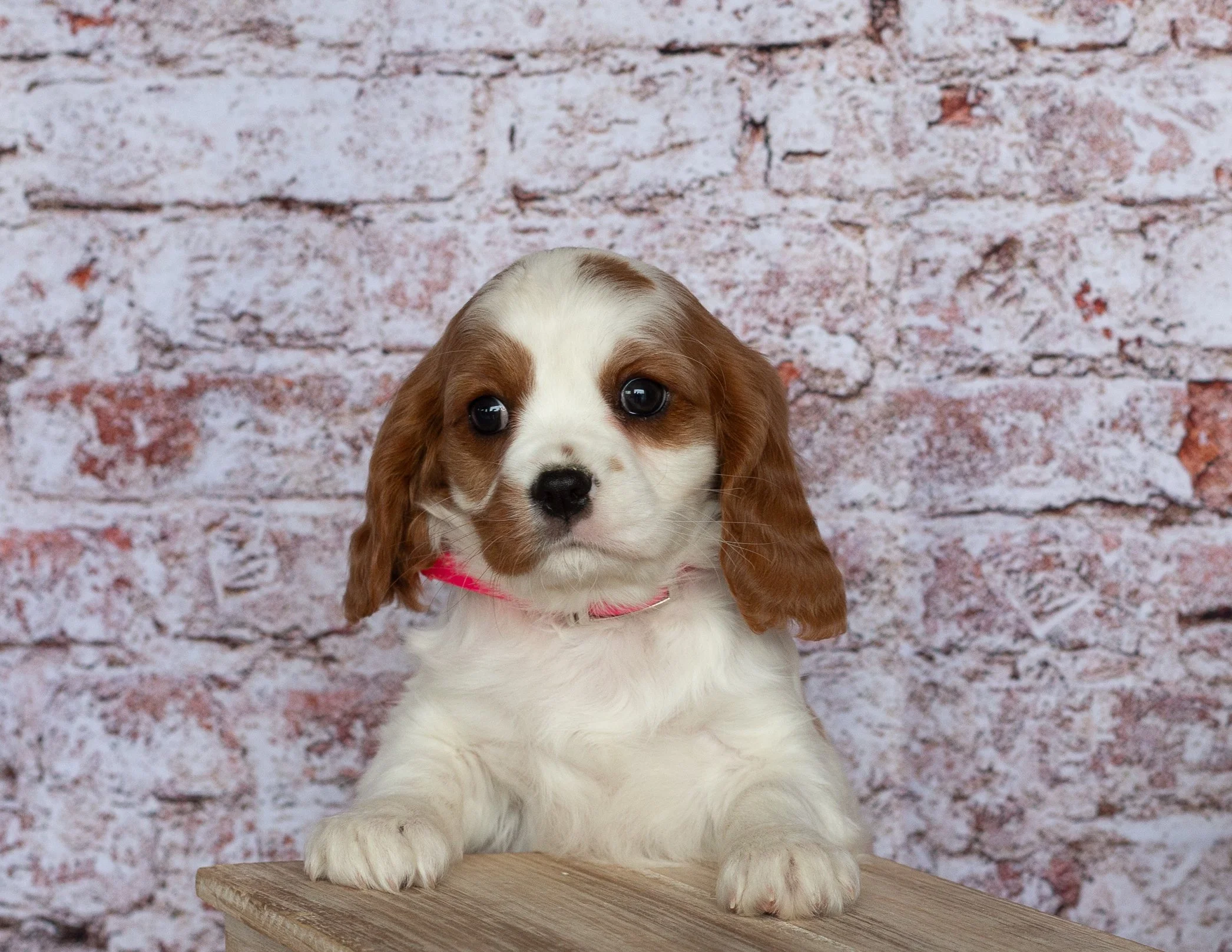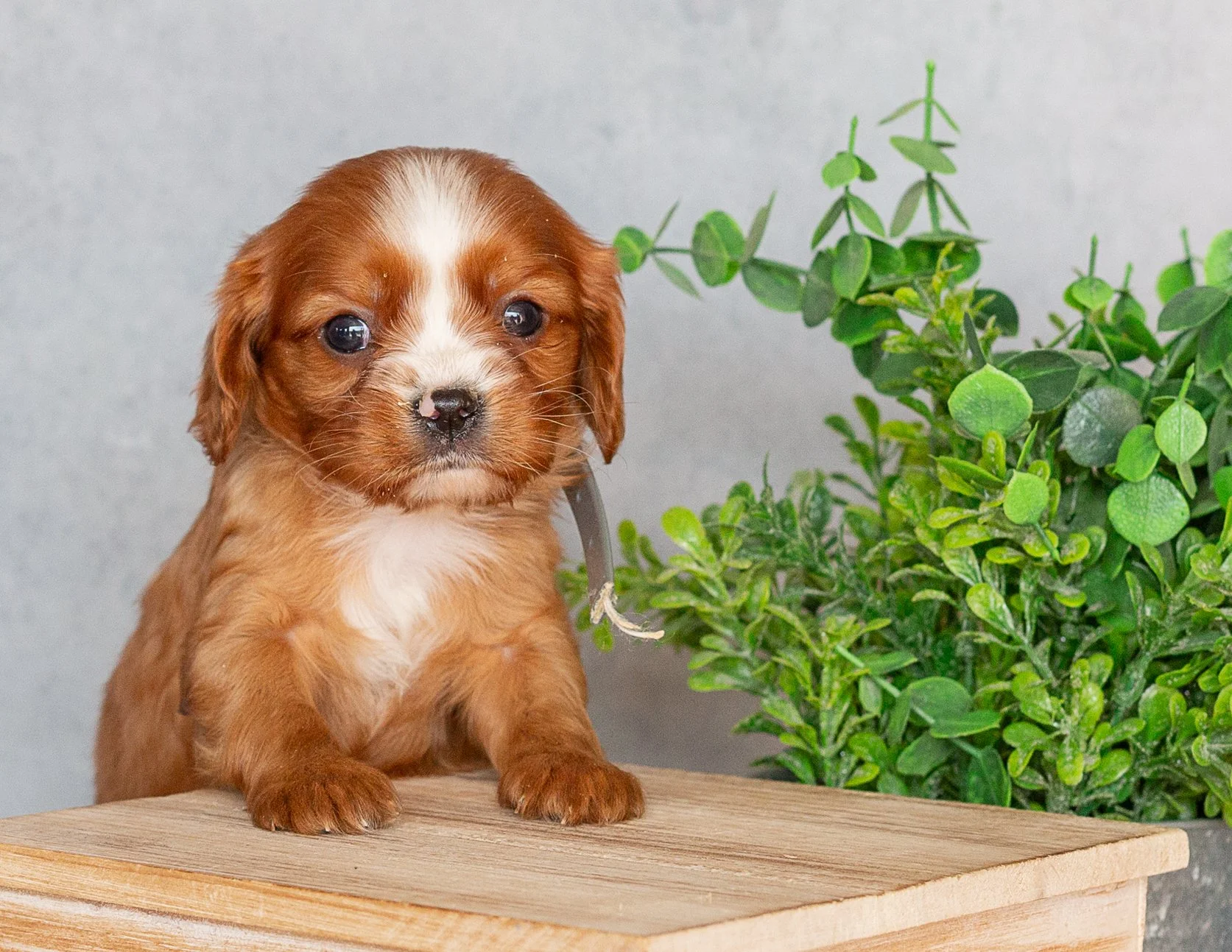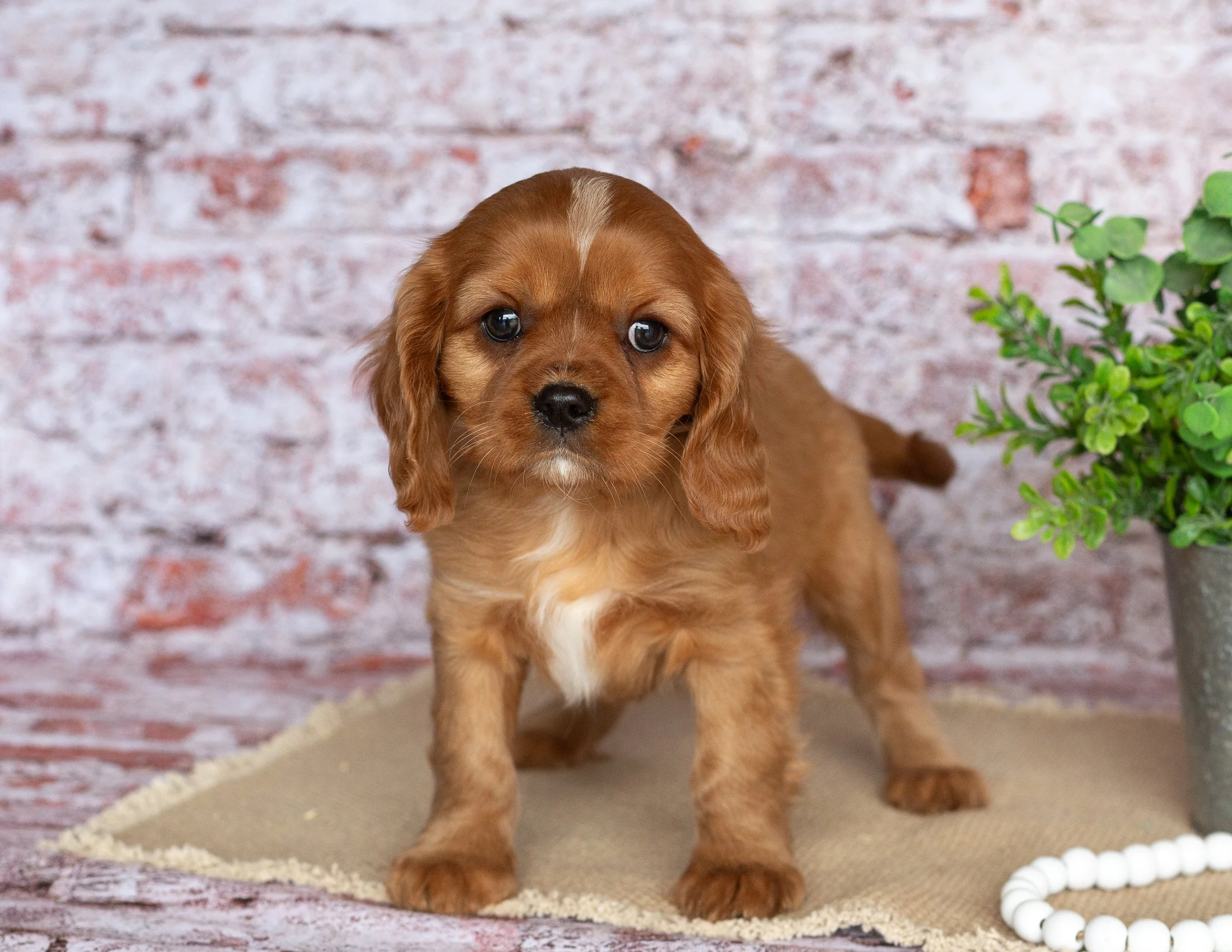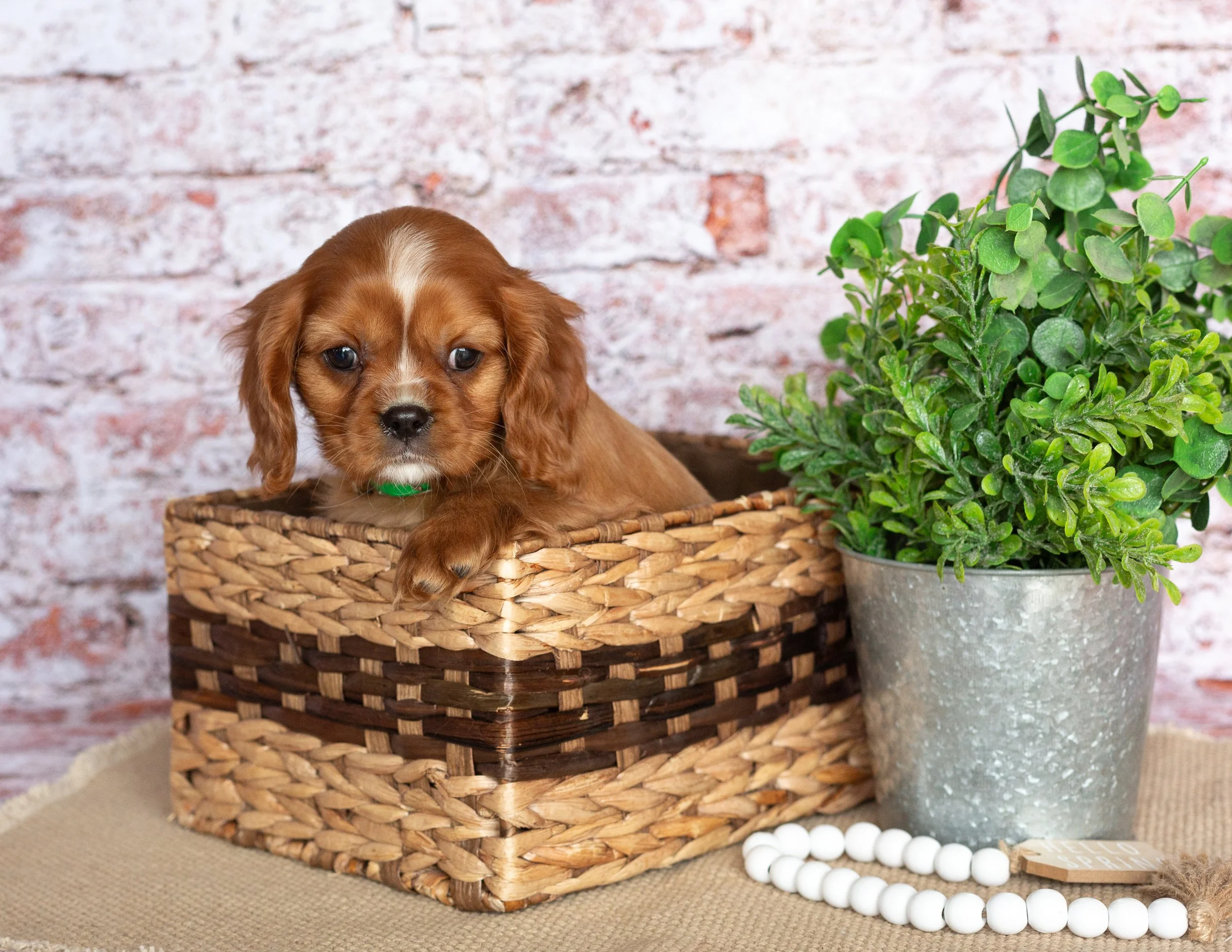 A cute Cavalier King Charles Spaniel puppy with brown and white fur sitting on a beige surface next to a potted green plant, with a string of white beads nearby, against a brick wall background.