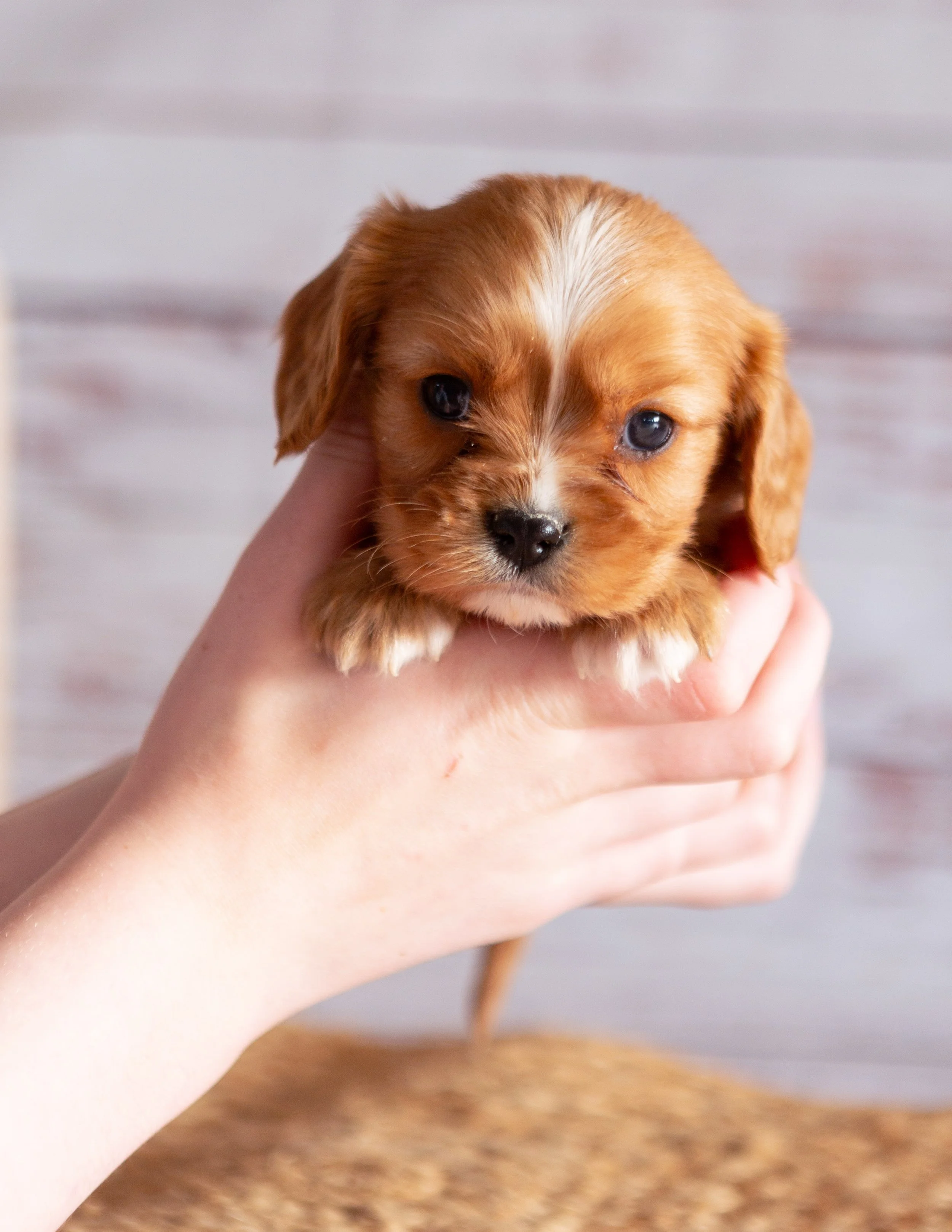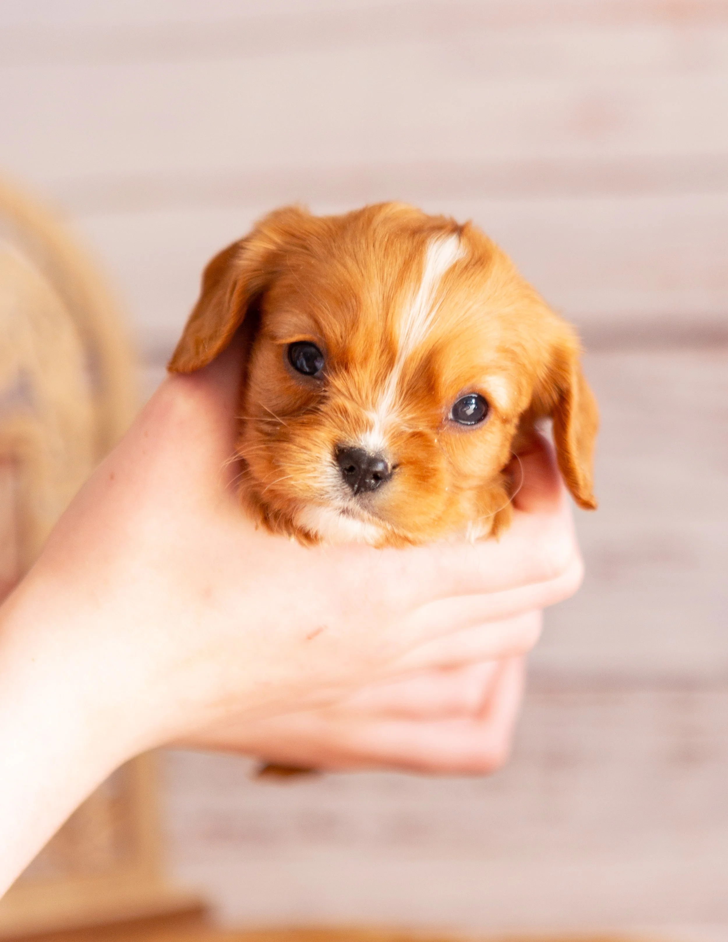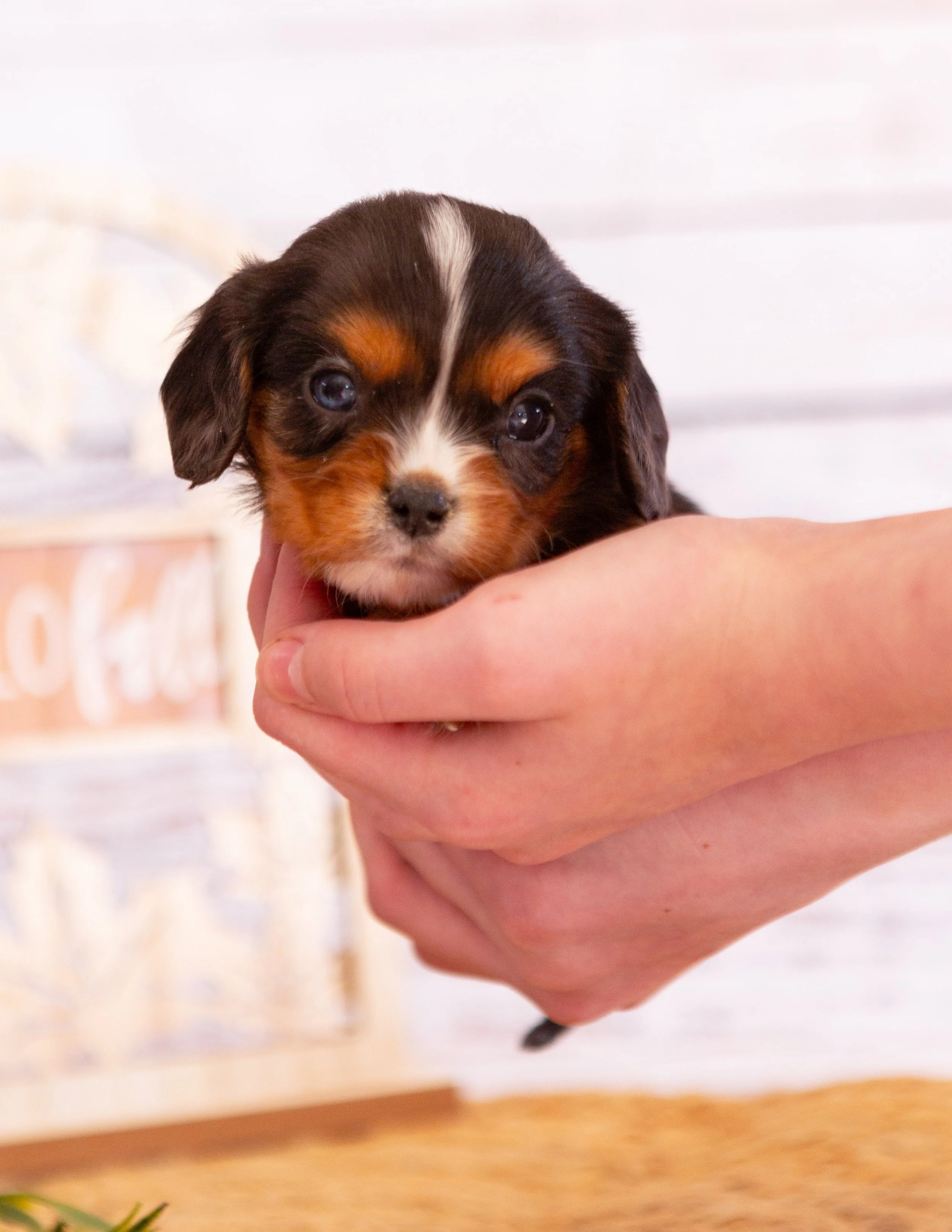 Person holding a small brown puppy with white markings and blue eyes, in front of a blurred background.