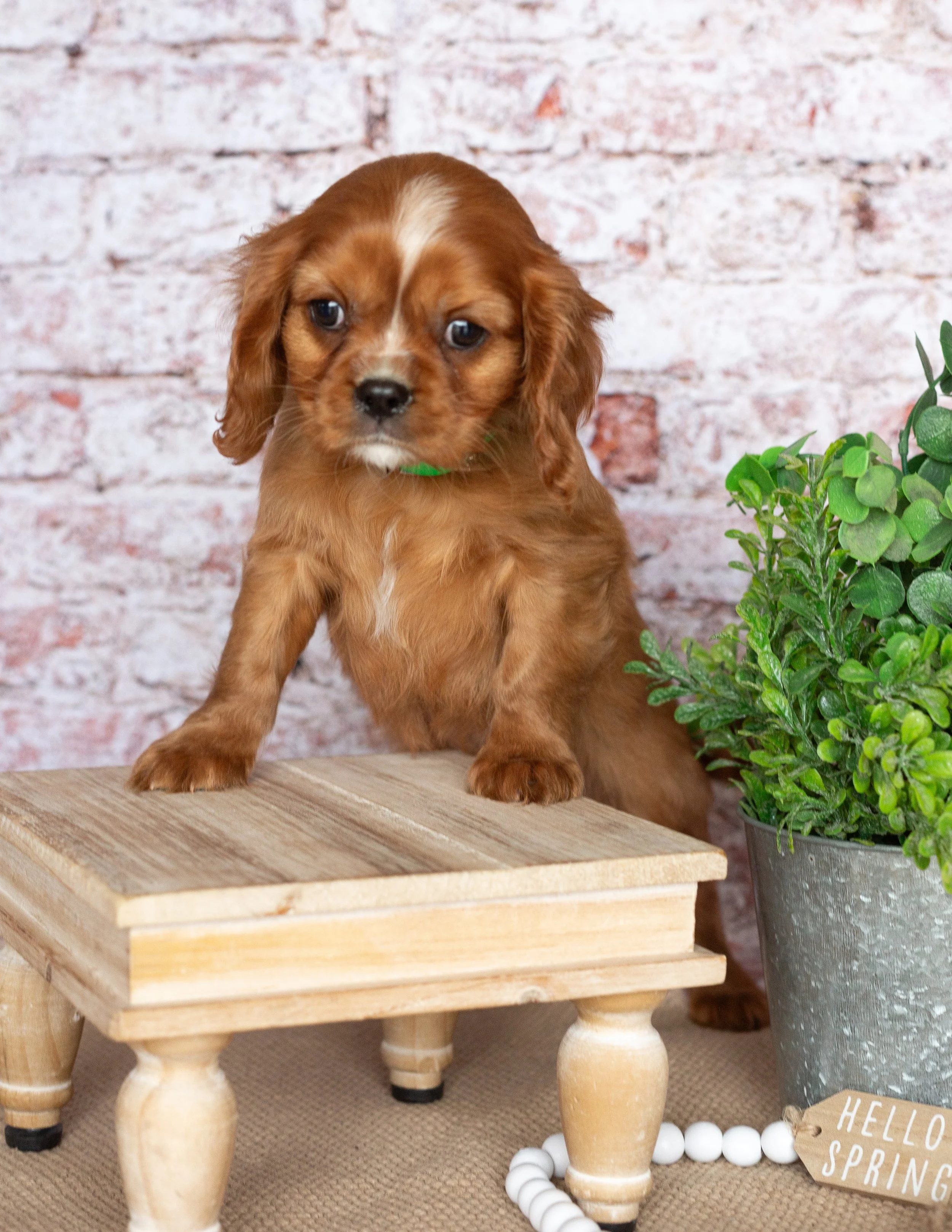 A cute brown puppy standing on a small wooden table next to a potted green plant. The background is a brick wall, and a small wooden sign reads 'HELLO SPRING' with white beads nearby.