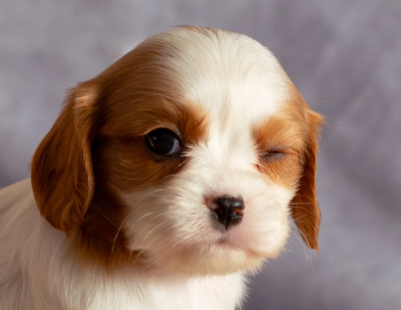 Close-up of a adorable puppy with one eye open and one eye closed, with brown and white fur and floppy ears.
