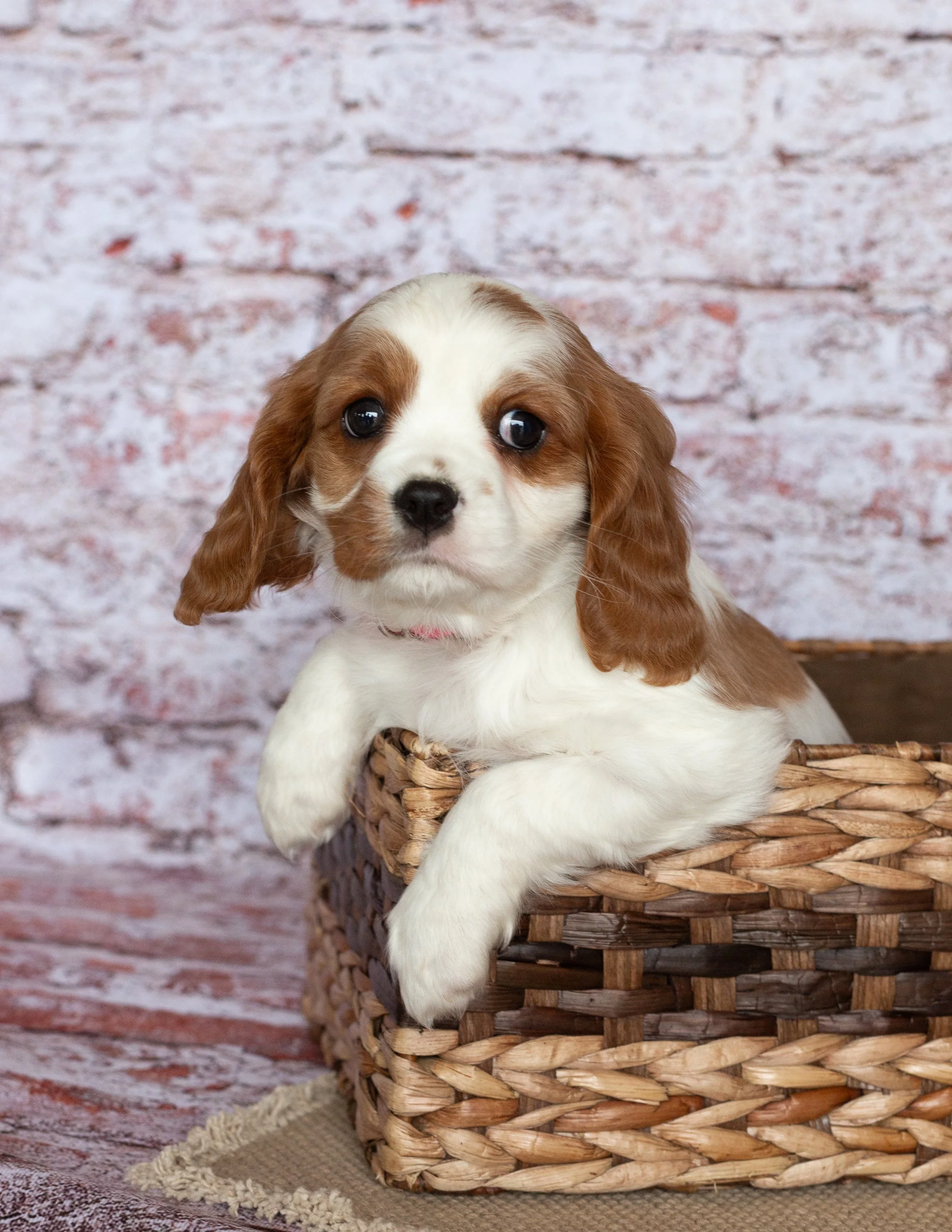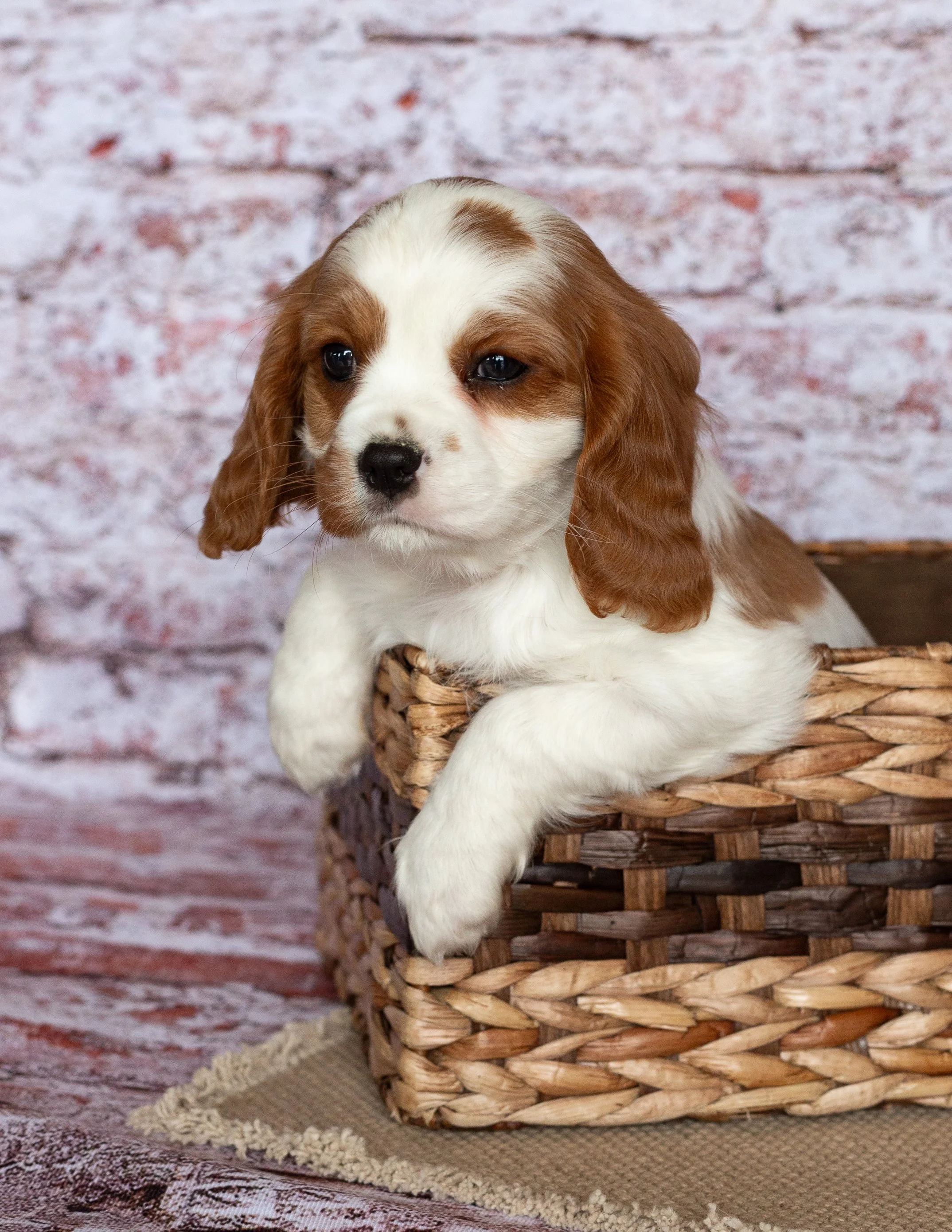 A puppy with brown and white fur, floppy ears, and expressive eyes sitting in a woven basket against a brick wall background.