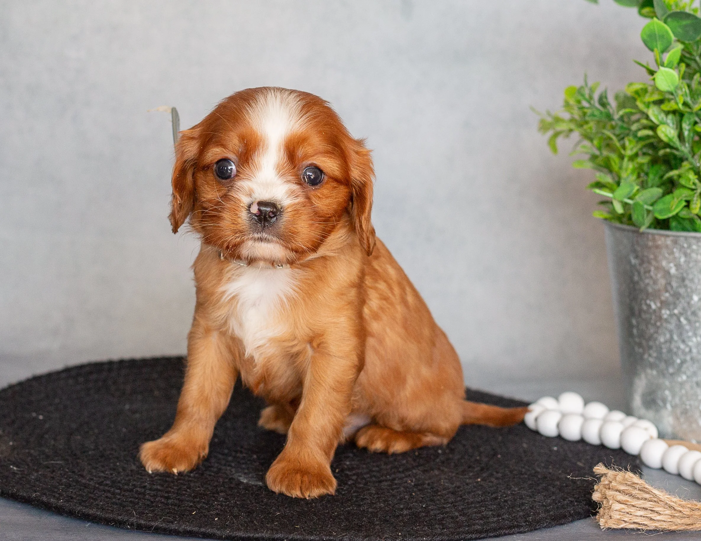 A cute brown puppy with white markings sitting on a black circular mat next to a potted green plant and a string of white beads.