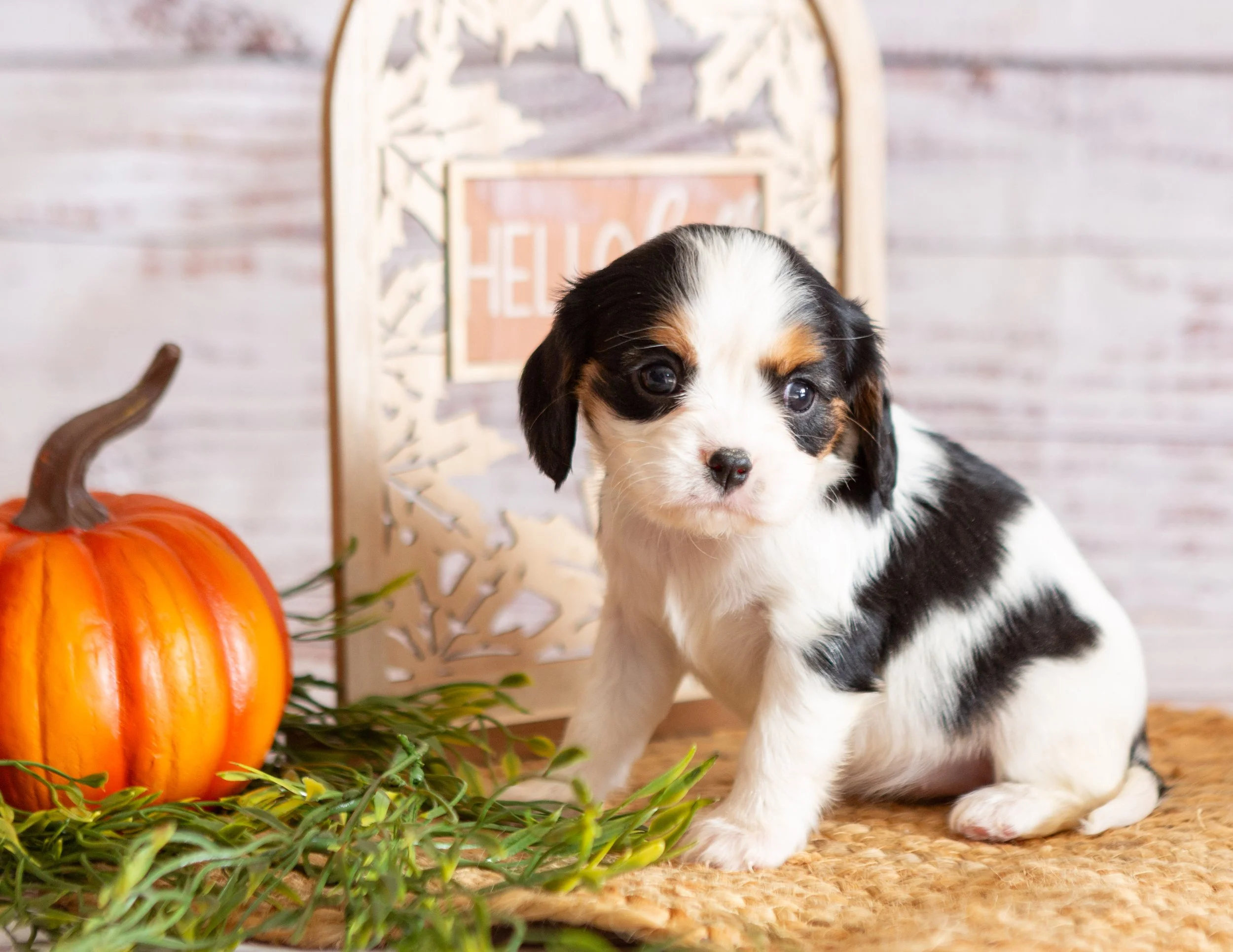 A cute black, white, and brown puppy sitting on a woven mat with a small pumpkin and green leaves beside it. In the background, there is a decorative wooden frame with a sign that says 'HELLO' and a white brick wall.