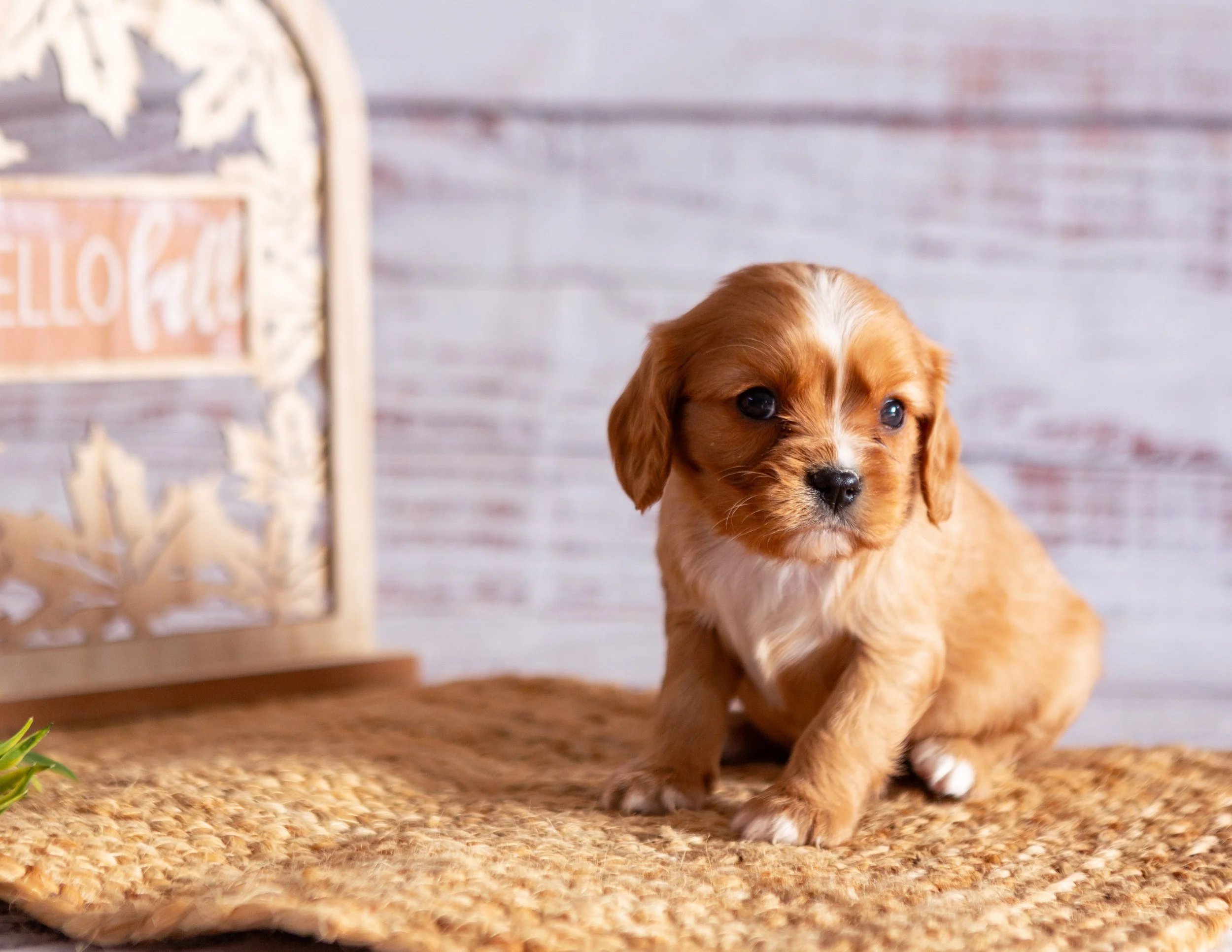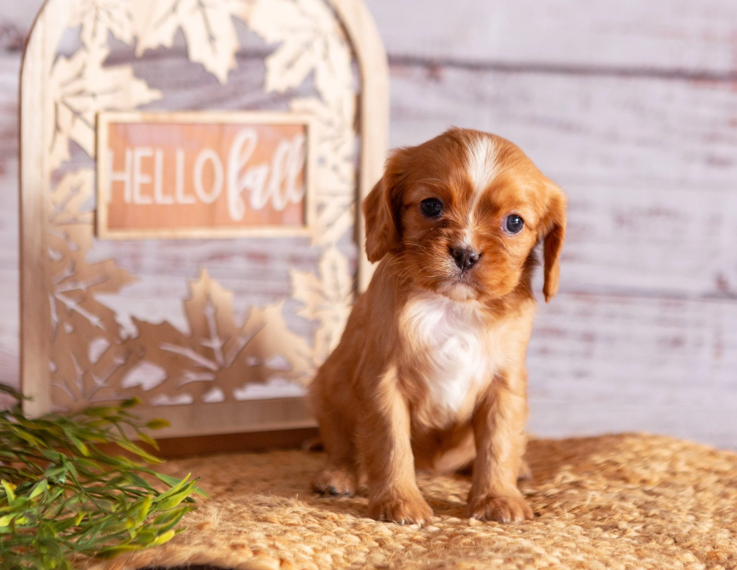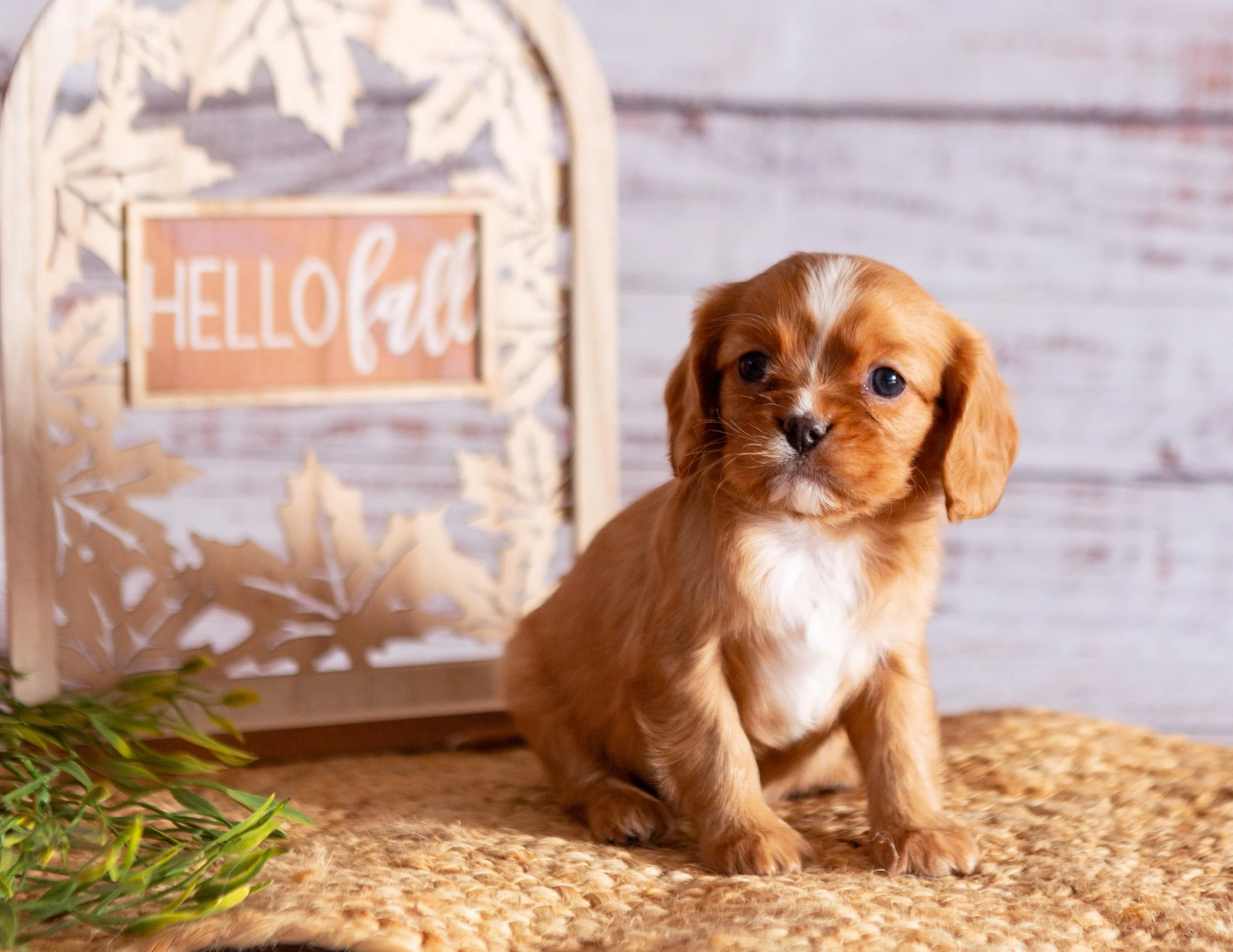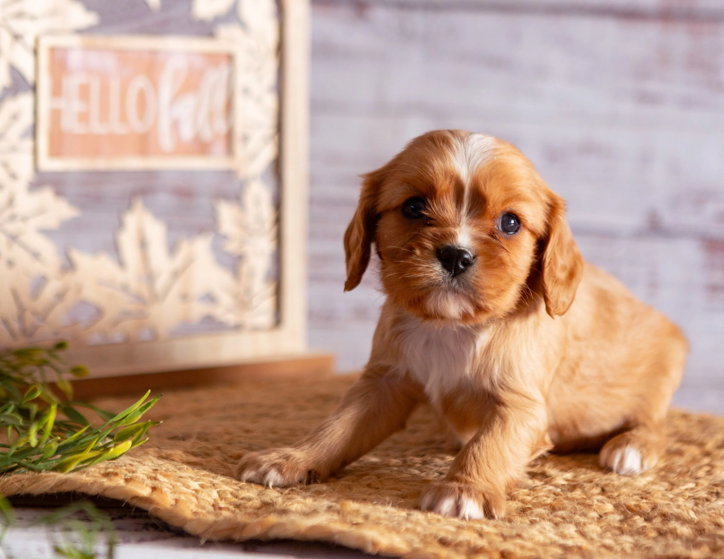A cute, small brown puppy with floppy ears and white chest sitting on a woven mat, with a decorative light-colored wooden frame with a pink sign that says 'HELLO fall' in the background, and some greenery in the foreground.