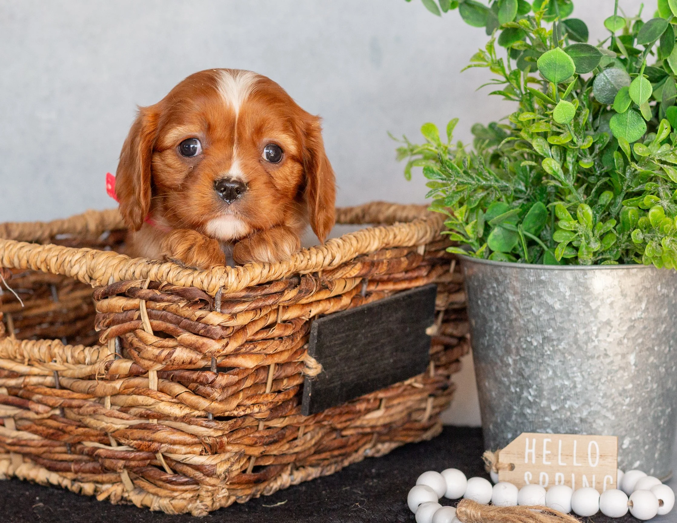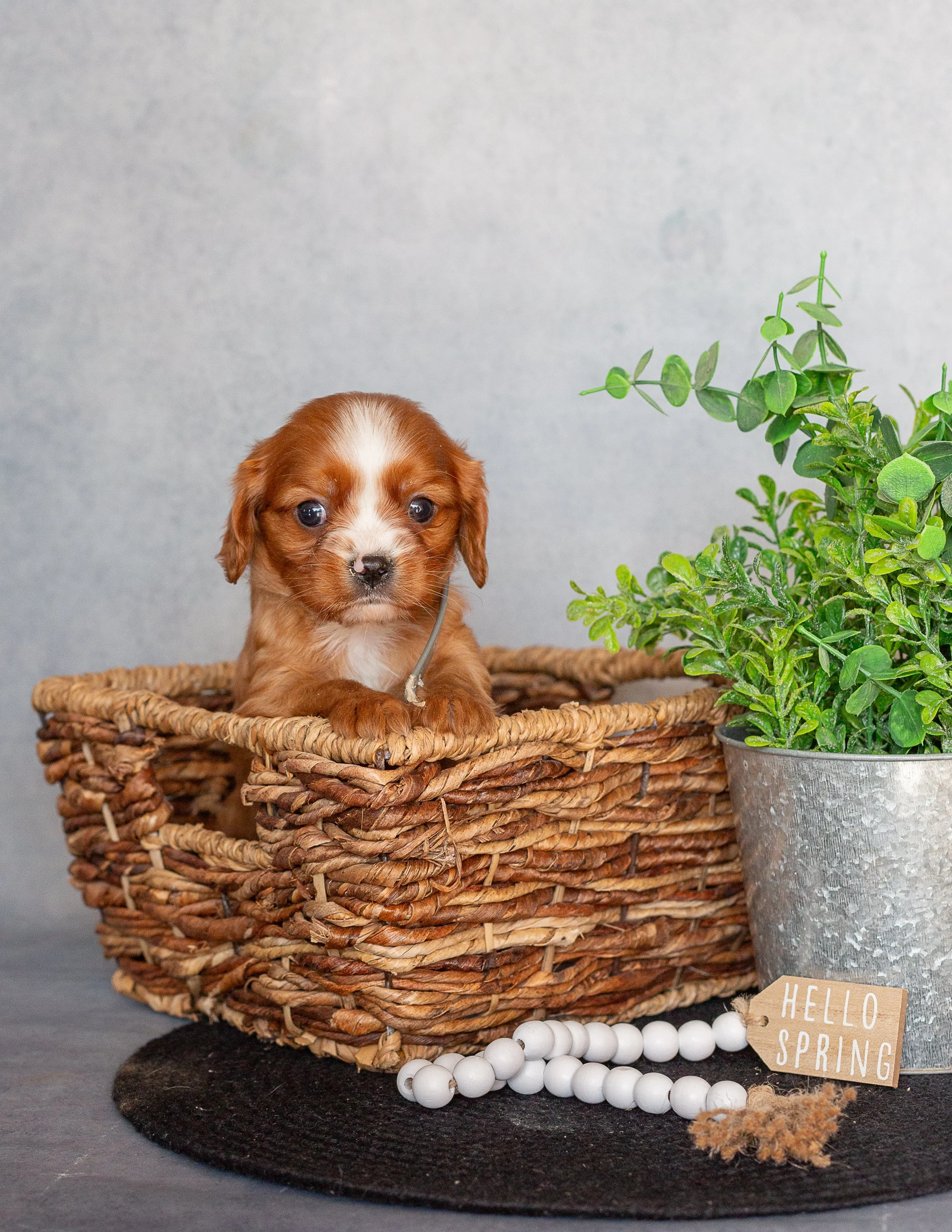 A small brown puppy with white markings inside a woven basket next to a potted green plant, with a 'Hello Spring' tag and white beaded necklace on a black round rug.