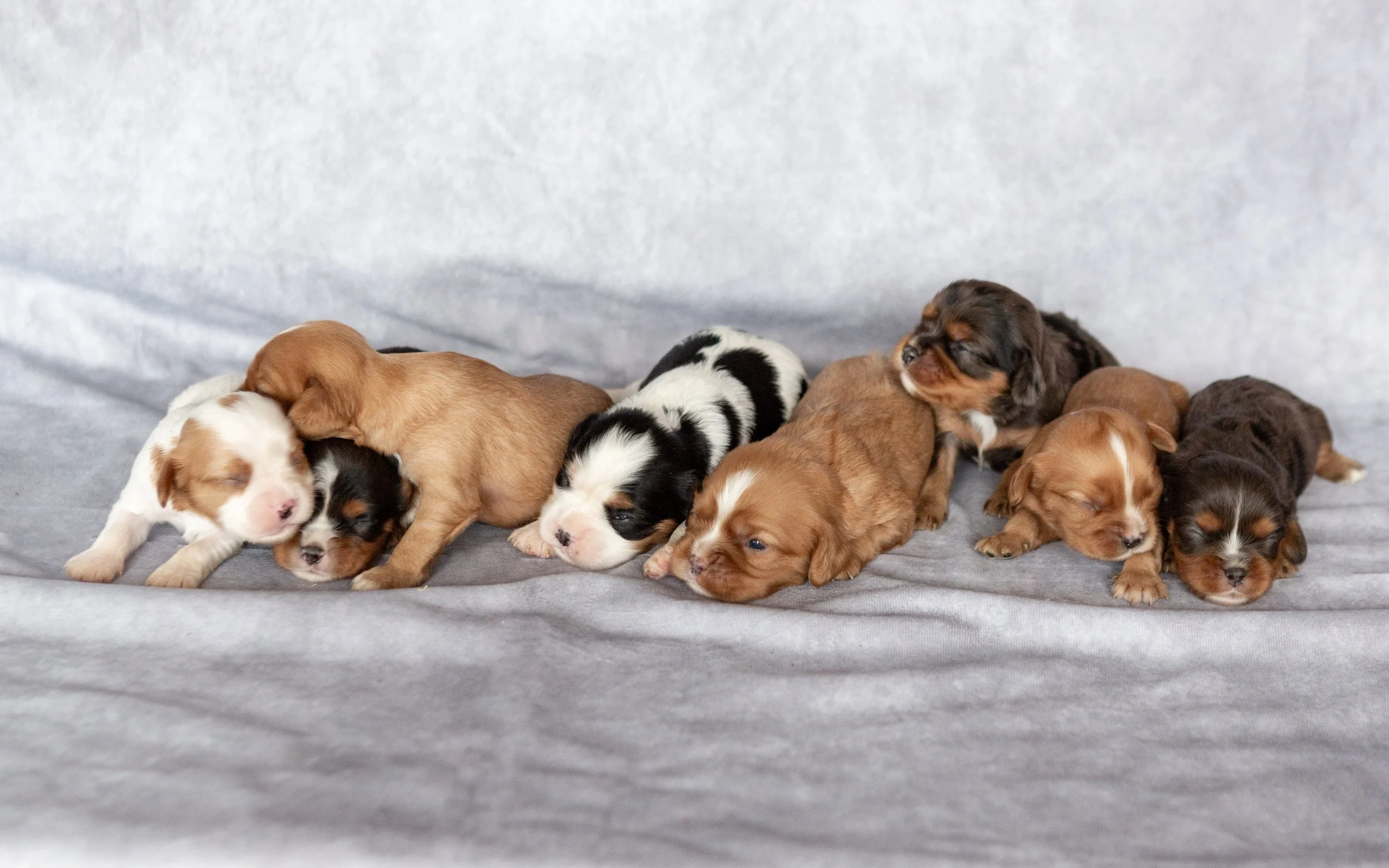 Group of eight adorable sleeping puppies of various breeds lying on a soft gray surface.