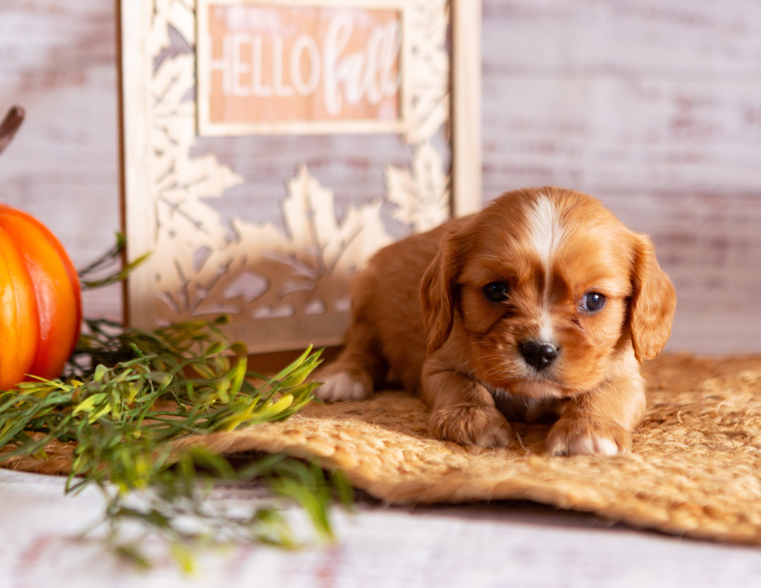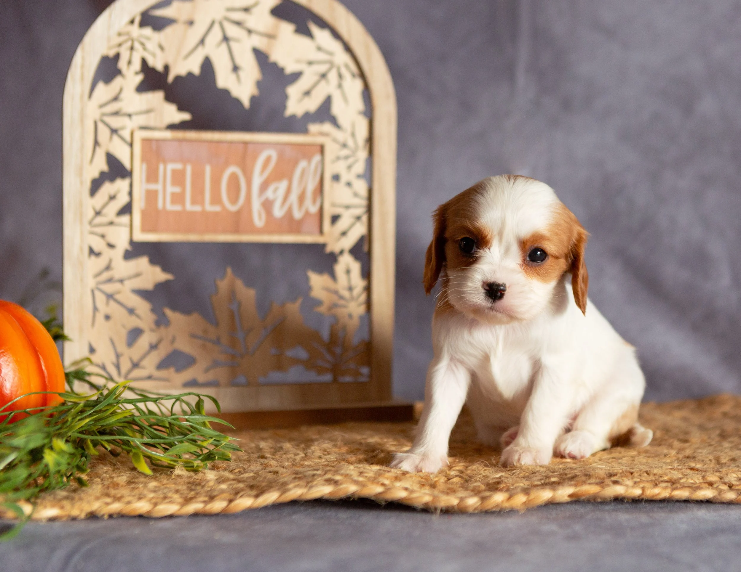 A small puppy with white and brown fur sitting on a woven mat, next to a pumpkin and green foliage, with a decorative sign in the background that says 'HELLO fall'.