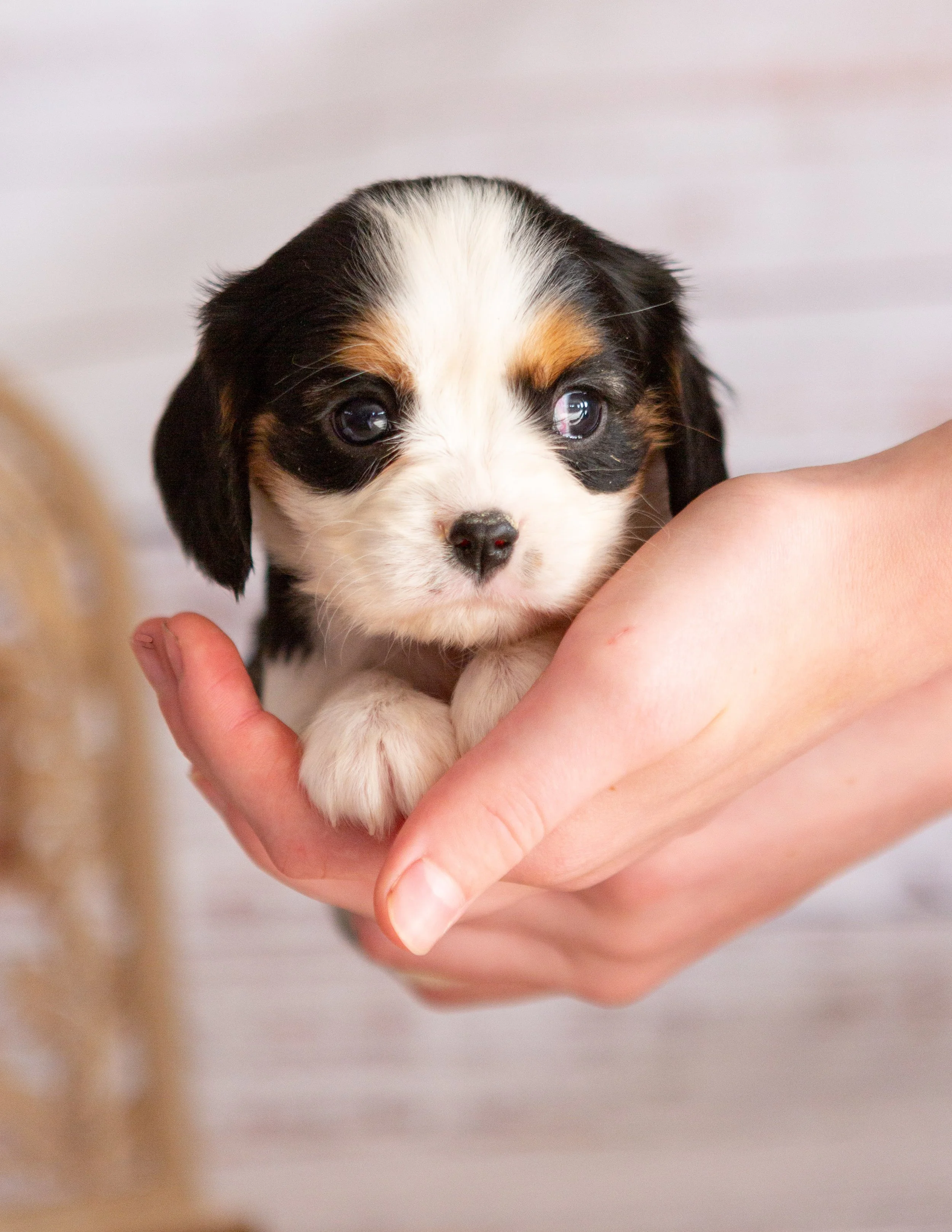 A small puppy with black, white, and tan fur being held in a person's hand.