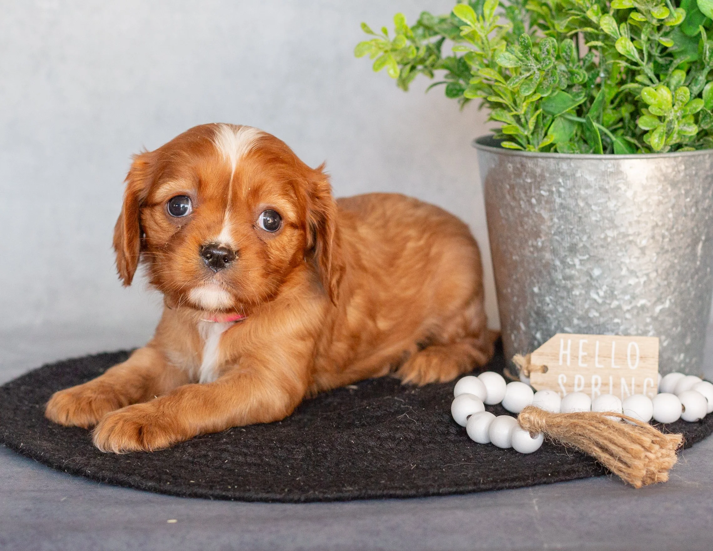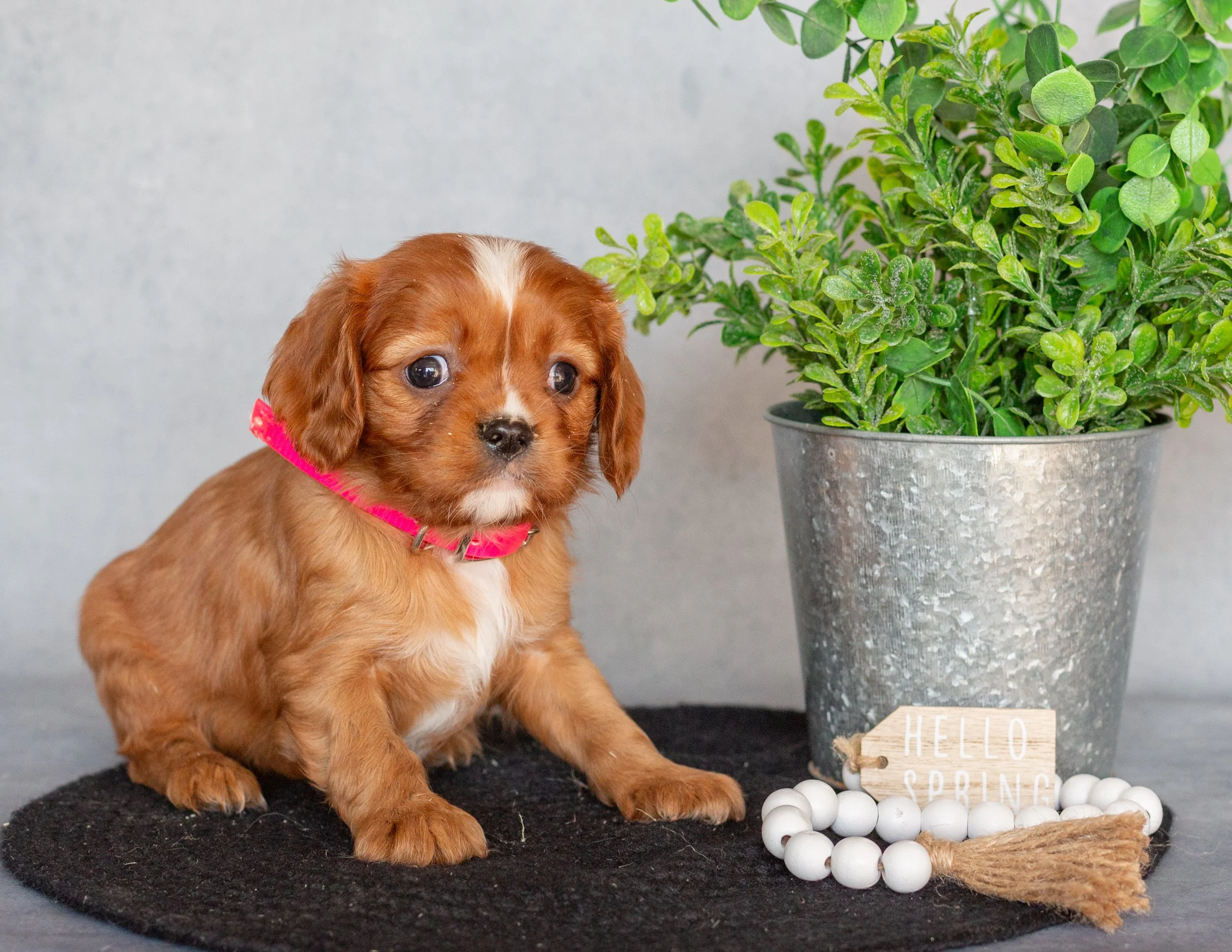 A cute brown puppy with a pink collar sitting on a black mat next to a potted green plant, a small wooden sign that reads 'Hello Spring', and a string of white beads with a tassel on a gray background.